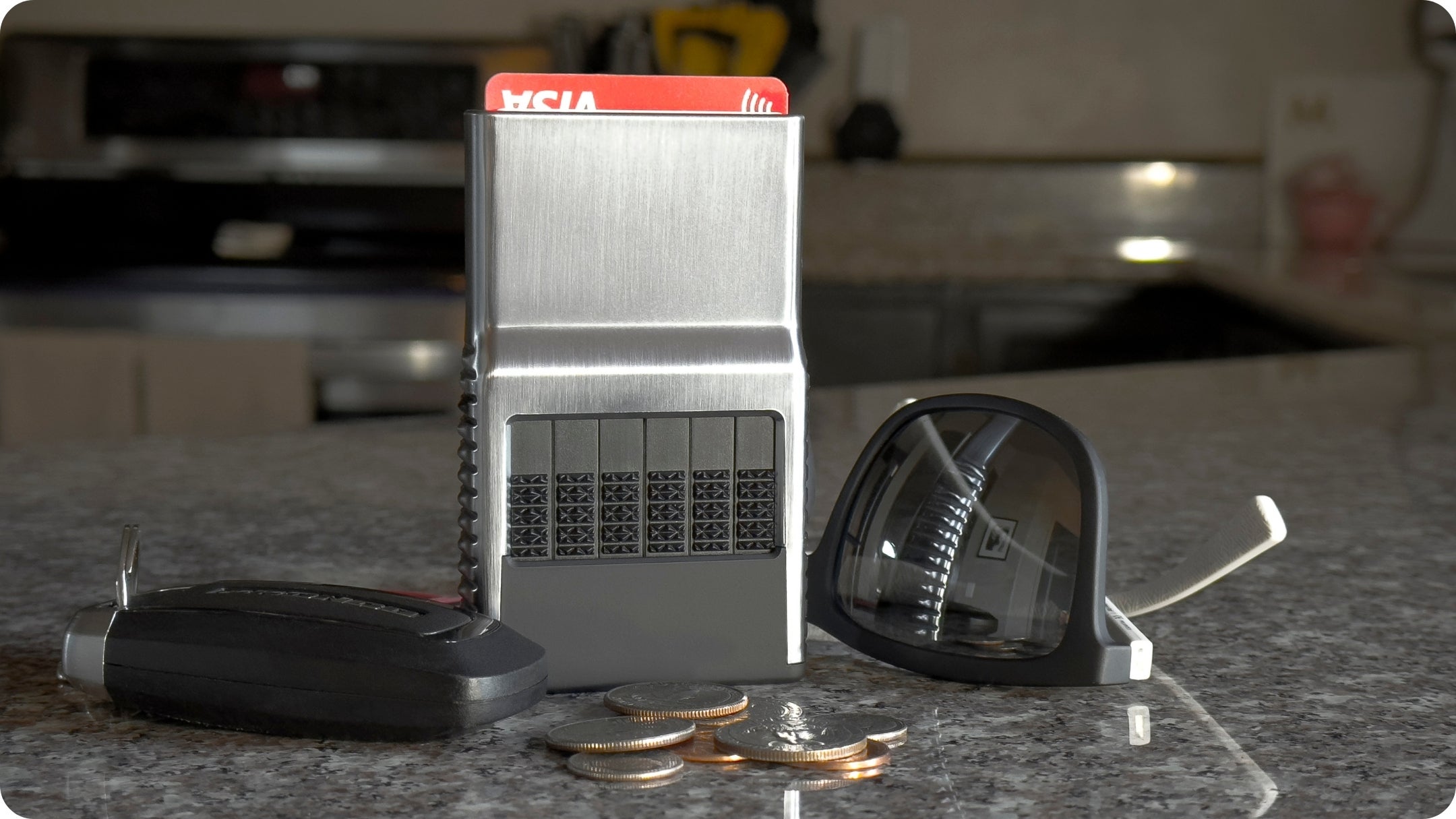 合成樹脂による一体型ボディと二層のメタルコーティングにより、クレジットカードの情報を保護するカードウォレットが完成しました。非常に強靭な作りで、映り込みの無いクロームカラーが高級感を際立たせます。