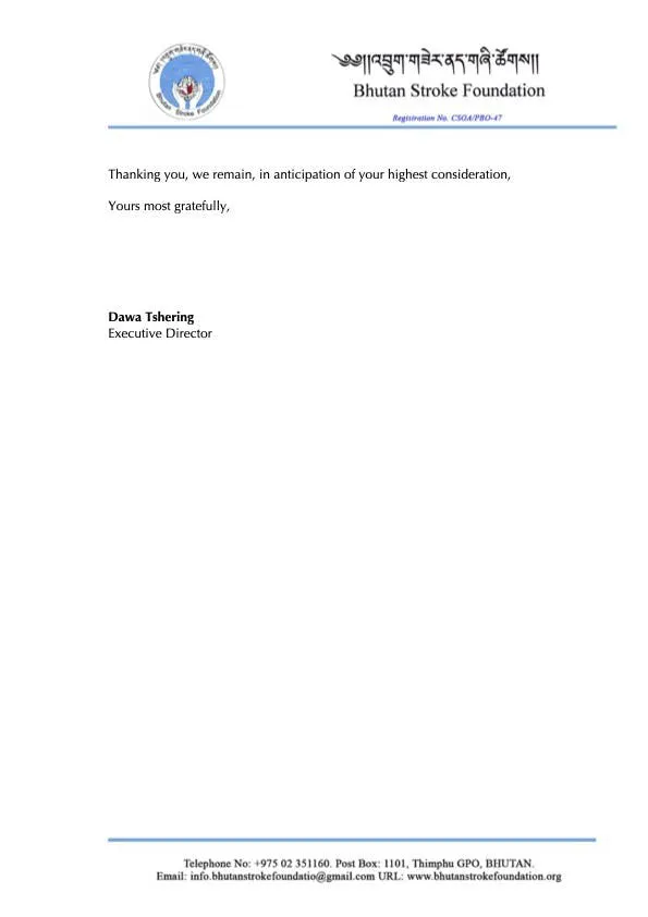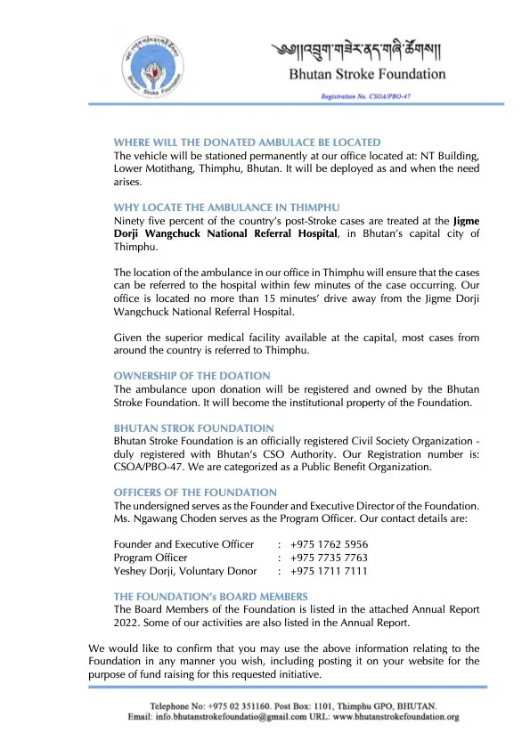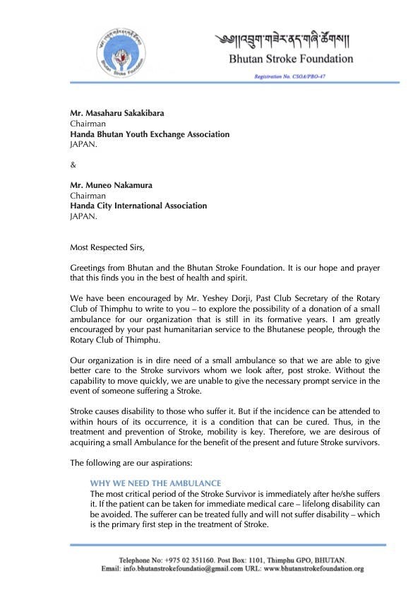 当団体はまだ発展途上の段階にあり、ティンプーロータリークラブの元クラブ幹事であるイシェ・ドルジ氏からの勧めで、貴団体に寄付の可能性を模索するために手紙を書きました。私たちは脳卒中の生存者に、より良いケアを提供するための小型救急車の寄付の可能性を探っています。