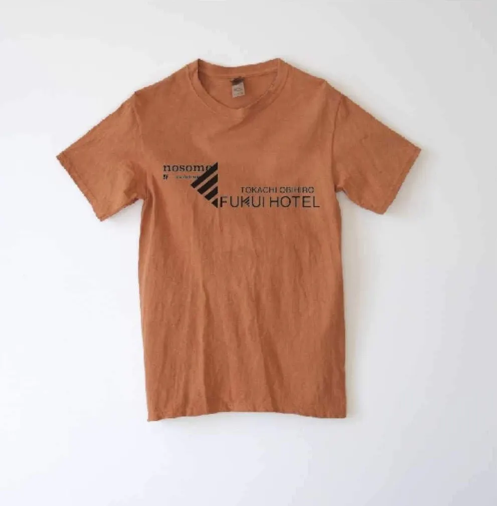 この商品は、ふく井ホテルのモール温泉の源泉で下処理を行い、北海道 本別町産の廃棄される玉ねぎの外皮で染料を製作し、反応させて染色したTシャツです。