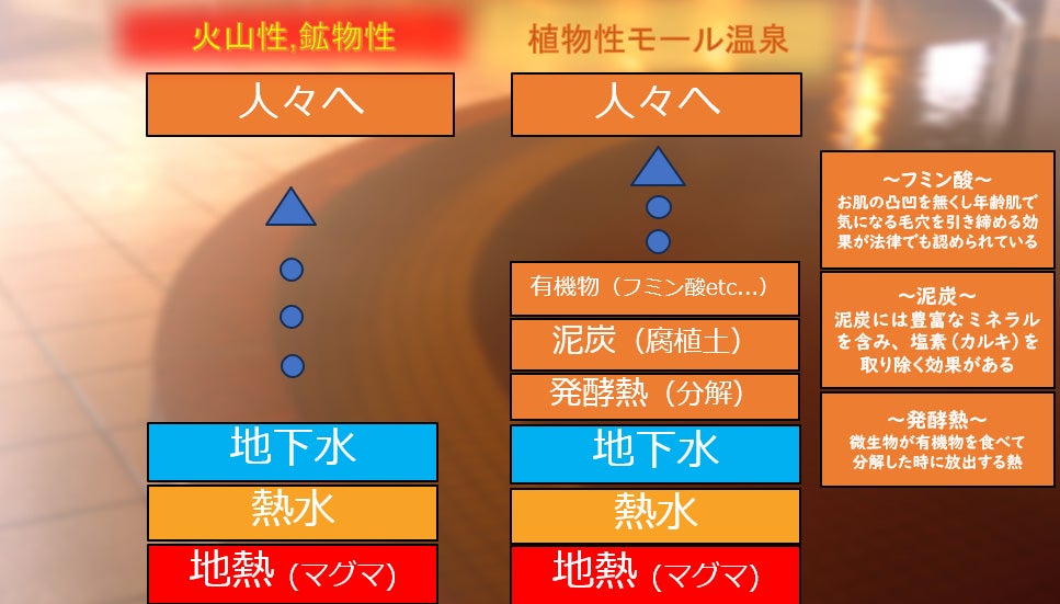 日本の一般的な温泉は鉱物性でマグマの熱により温められたものですが、植物性モール温泉は地熱+微生物が有機物を食べて分解した時に放出する発酵熱や、葦など植物が堆積され腐ってできる腐植土(泥炭)があり泥炭には豊富なミネラルを含み、フミン酸・フルボ酸というお肌の凸凹を無くし年齢肌で気になる毛穴を引き締める成分が入っていることから『美人の湯』と呼ばれております。