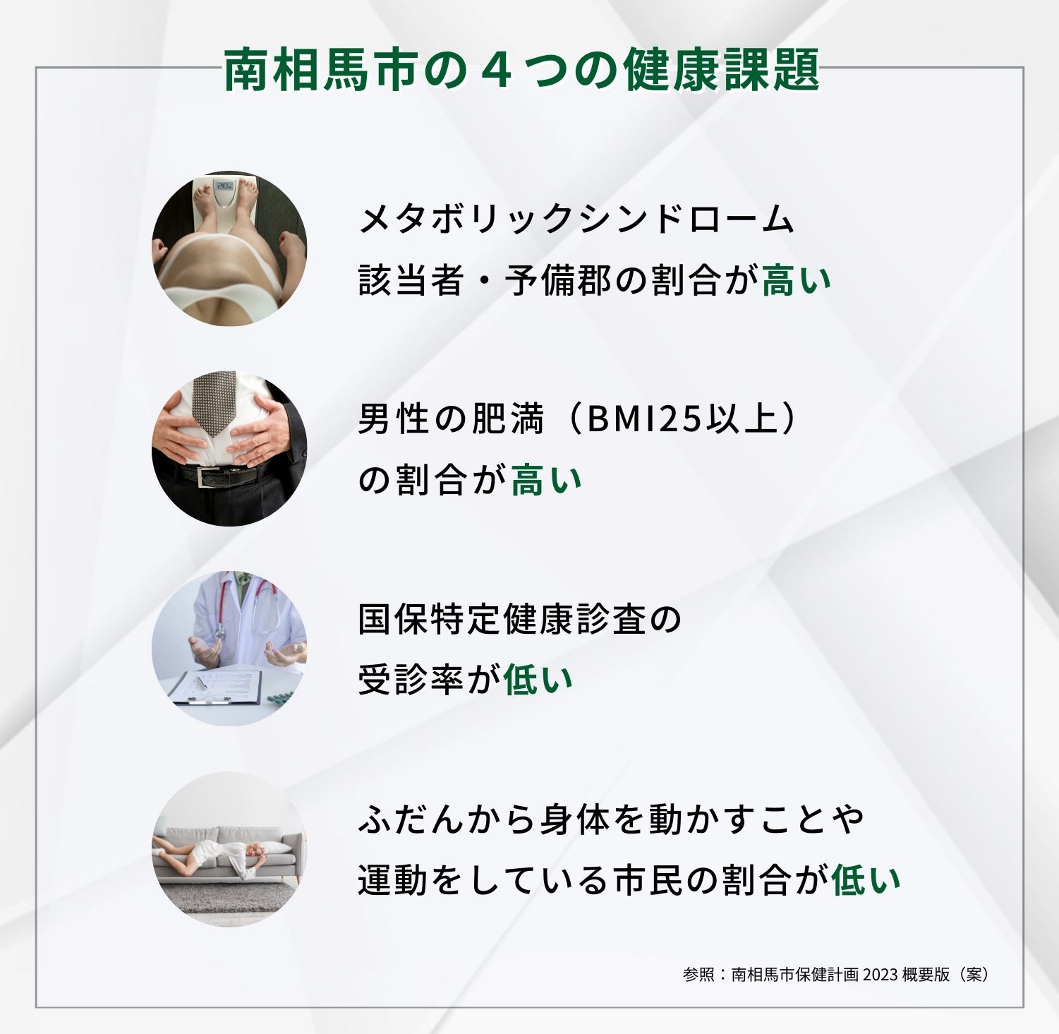 復興に向けて進み続けている街で、スポーツトレーナーとして何か出来ないかと模索し、数年にわたり解決出来ていない健康課題を知りました。