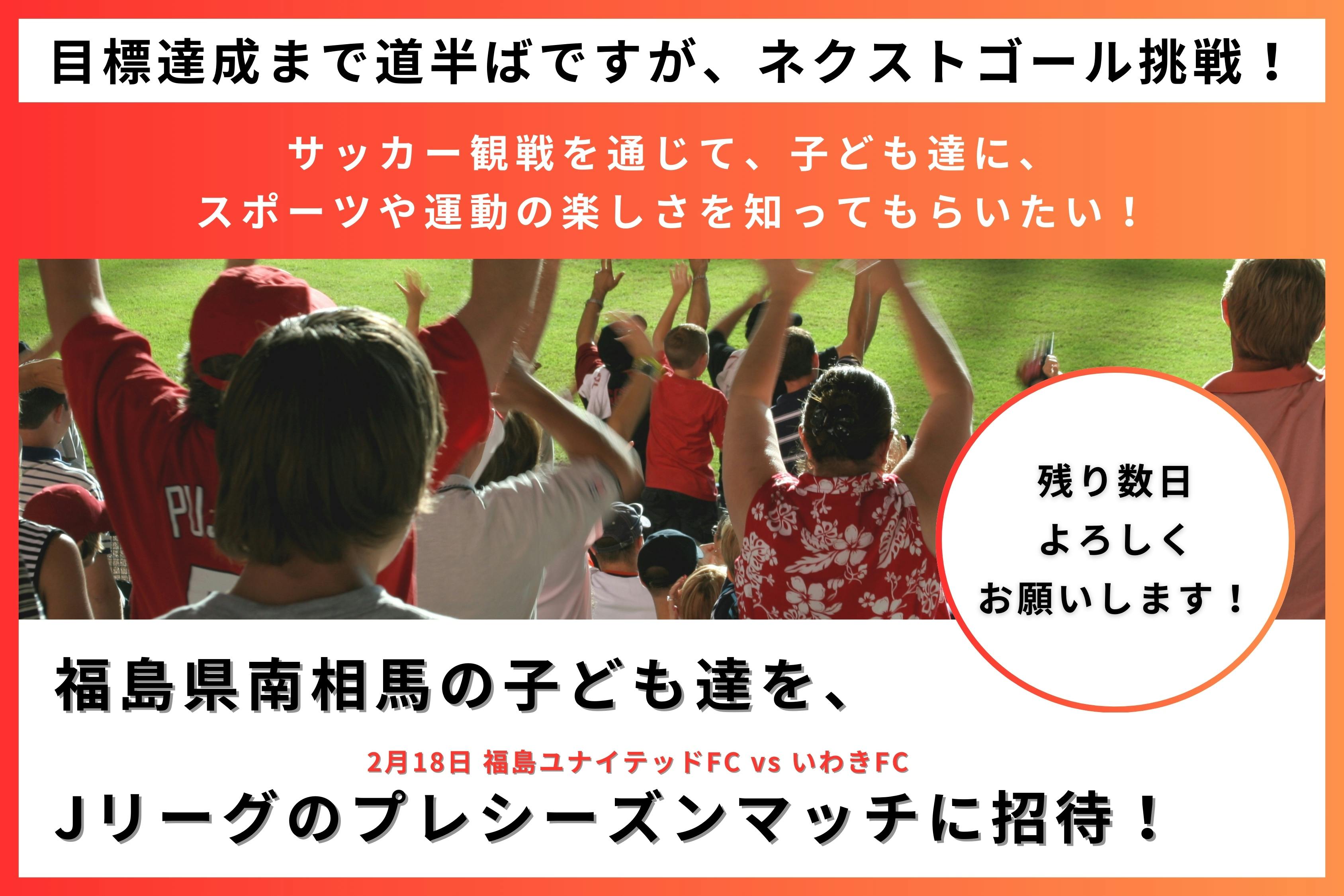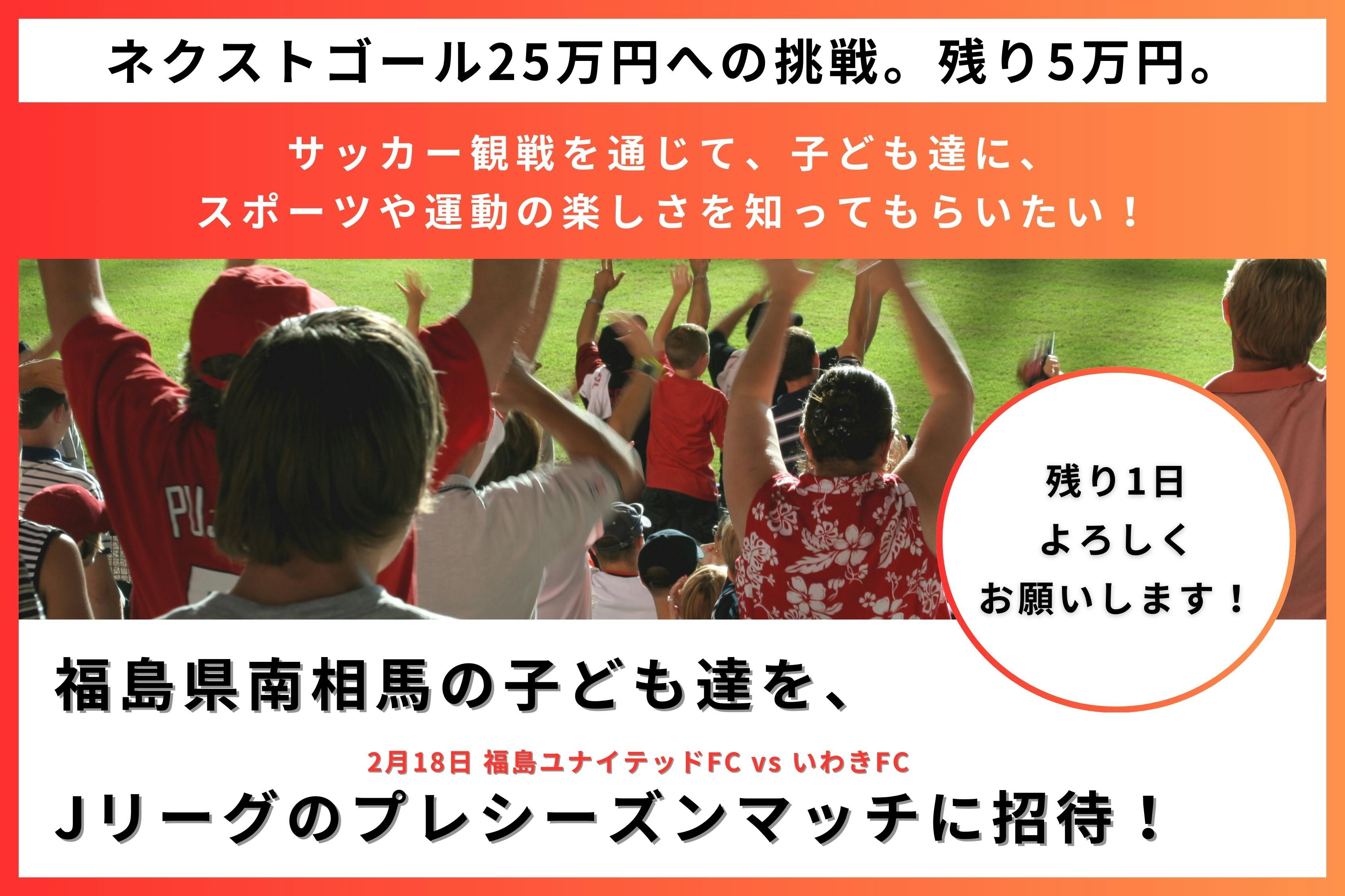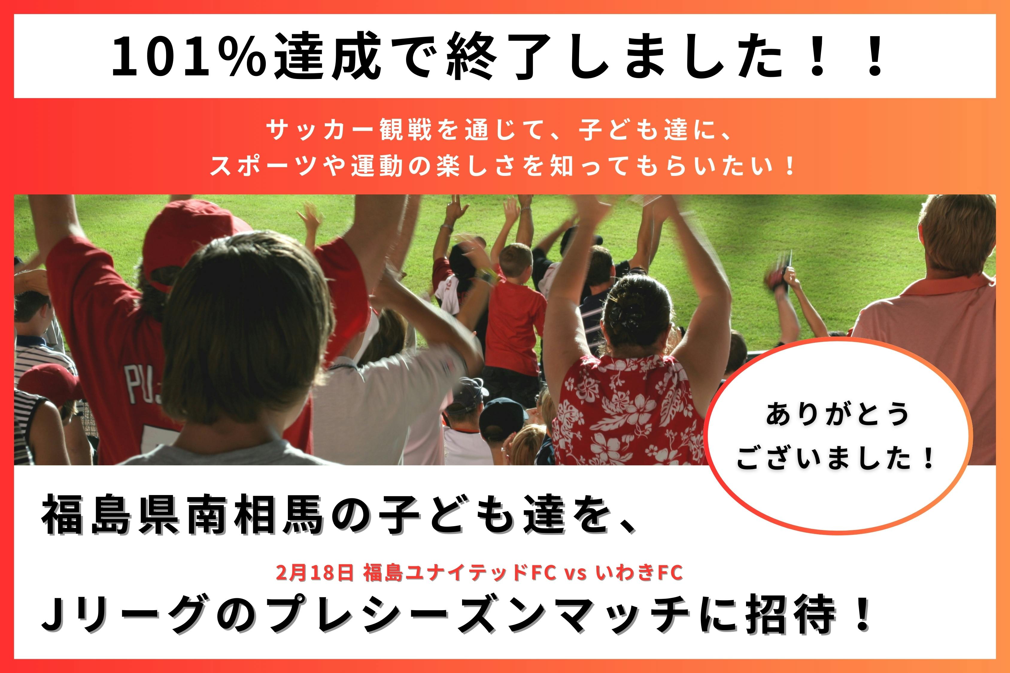 2024/02/19 18:00【クラウドファンディング終了】2月18日(日)をもちまして、10日間のクラウドファンディングが終了しました!ご支援、ご協力、応援いただき、誠にありがとうございました。南相馬の子ども達をJリーグの試合に無料招待する、観戦ツアーの開催にあたり始めたクラウドファンディングでした。皆さまのおかげで、無事、2月18日(日)、観戦ツアーを開催することが出来ました。今回の鹿のクラウドファンディングは、目標設定金額20万円に対して、101%達成の20万2千円で閉幕です。今後も継続して南相馬の健康課題解決や運動のきっかけづくりのためのイベントを開催させていただきたく考えております。引き続き、鹿をよろしくお願いいたします。ご支援、ご協力、応援、本当にありがとうございました!鹿*ご支援いただきました皆さまへのご案内リターンに関しましては、下記リターンお届け予定時期に合わせて順次お送りさせていただきます。よろしくお願いいたします。・2,000円プラン:2024年3月中・3,000円プラン〜50,000円プラン:2024年4月中 もっと見る
