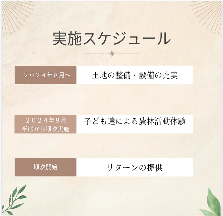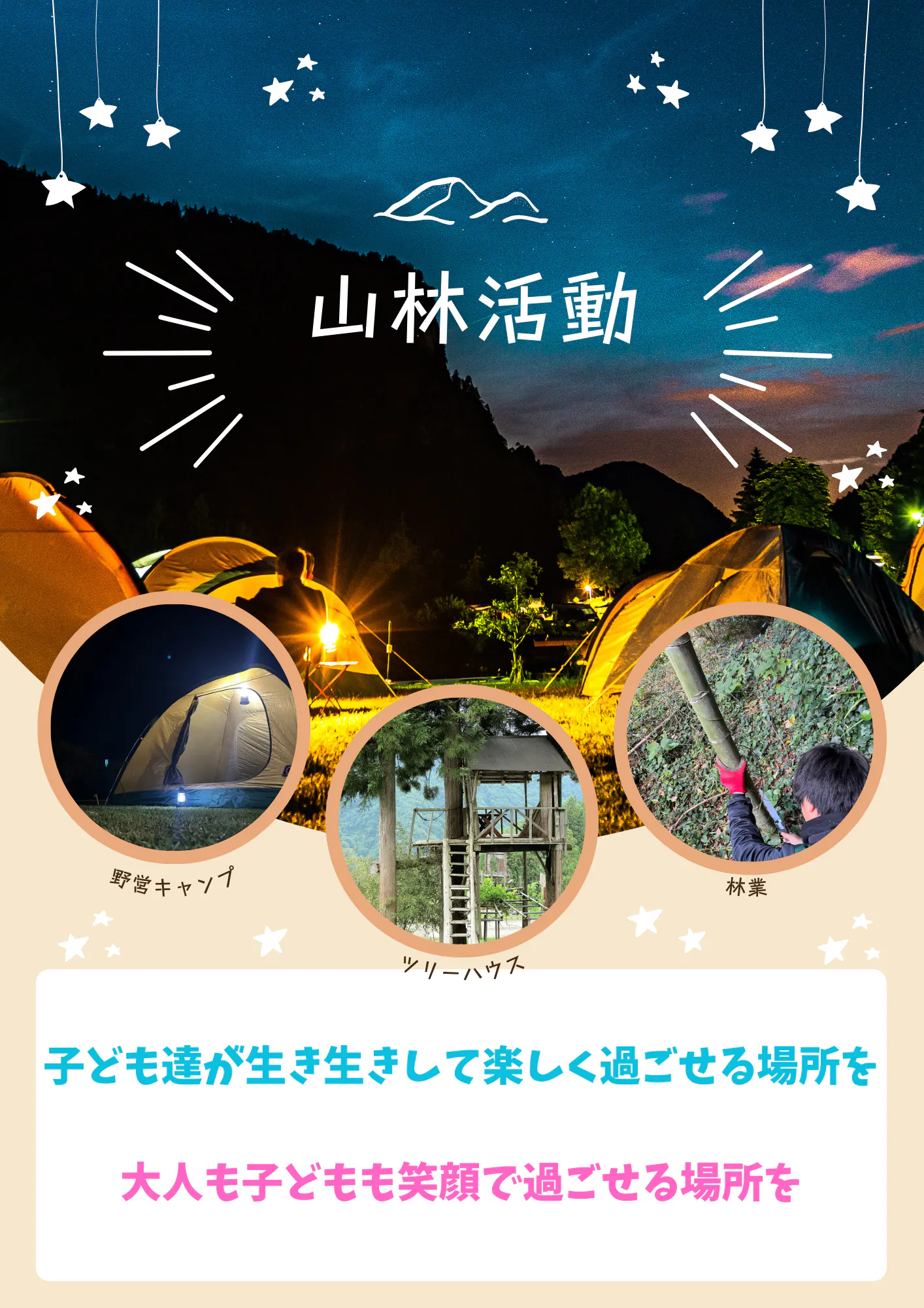 阿蘇の山林を購入し、体験活動として野営キャンプやツリーハウス建築体験、その他森林活動、林業等の職業体験に伴う工具や作業着などの費用等、農具や設備及び運営維持の為の人件費等に対して使用させていただきます。子どもたちの支援の目的以外では決して使用いたしませんのでご安心ください。