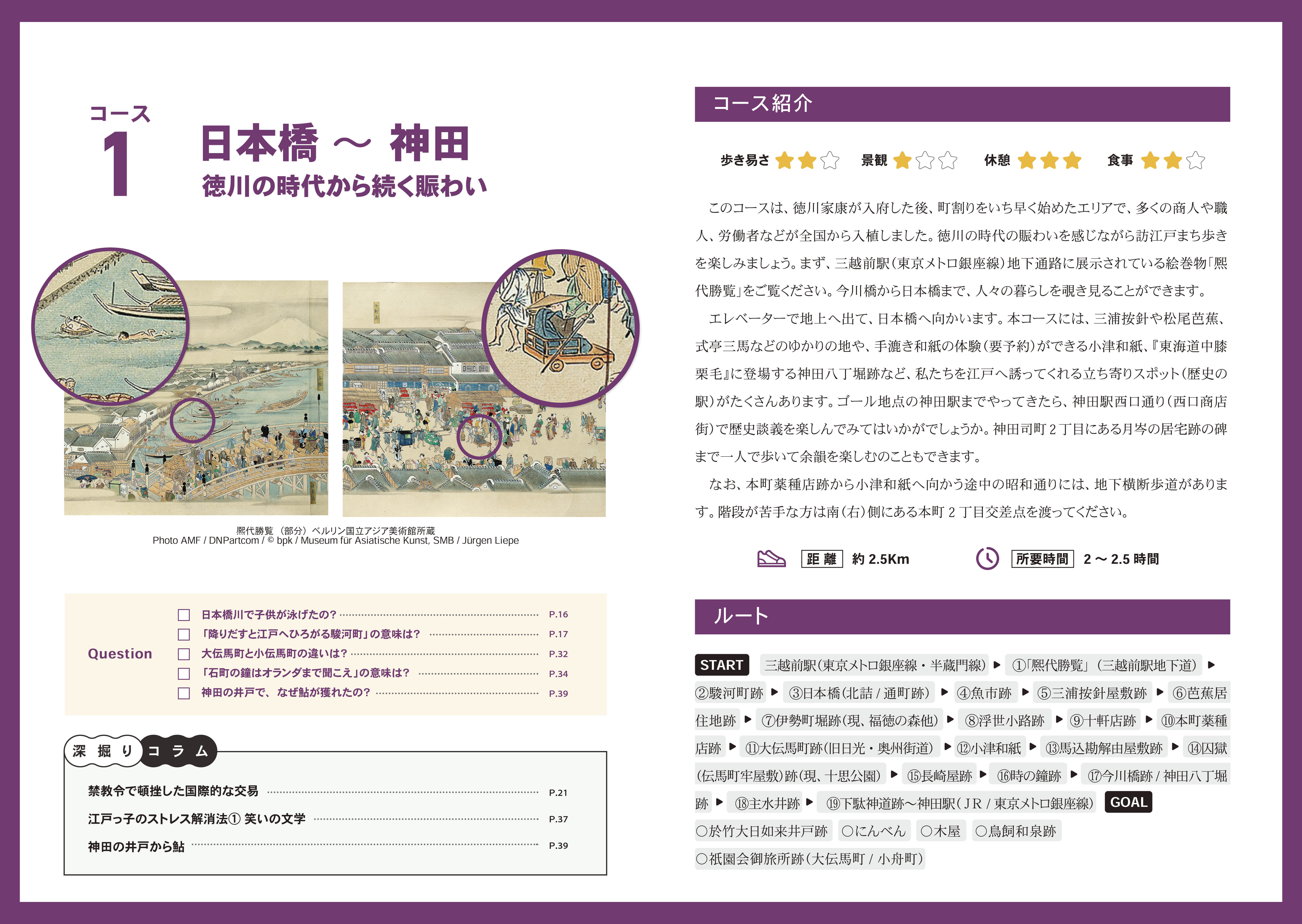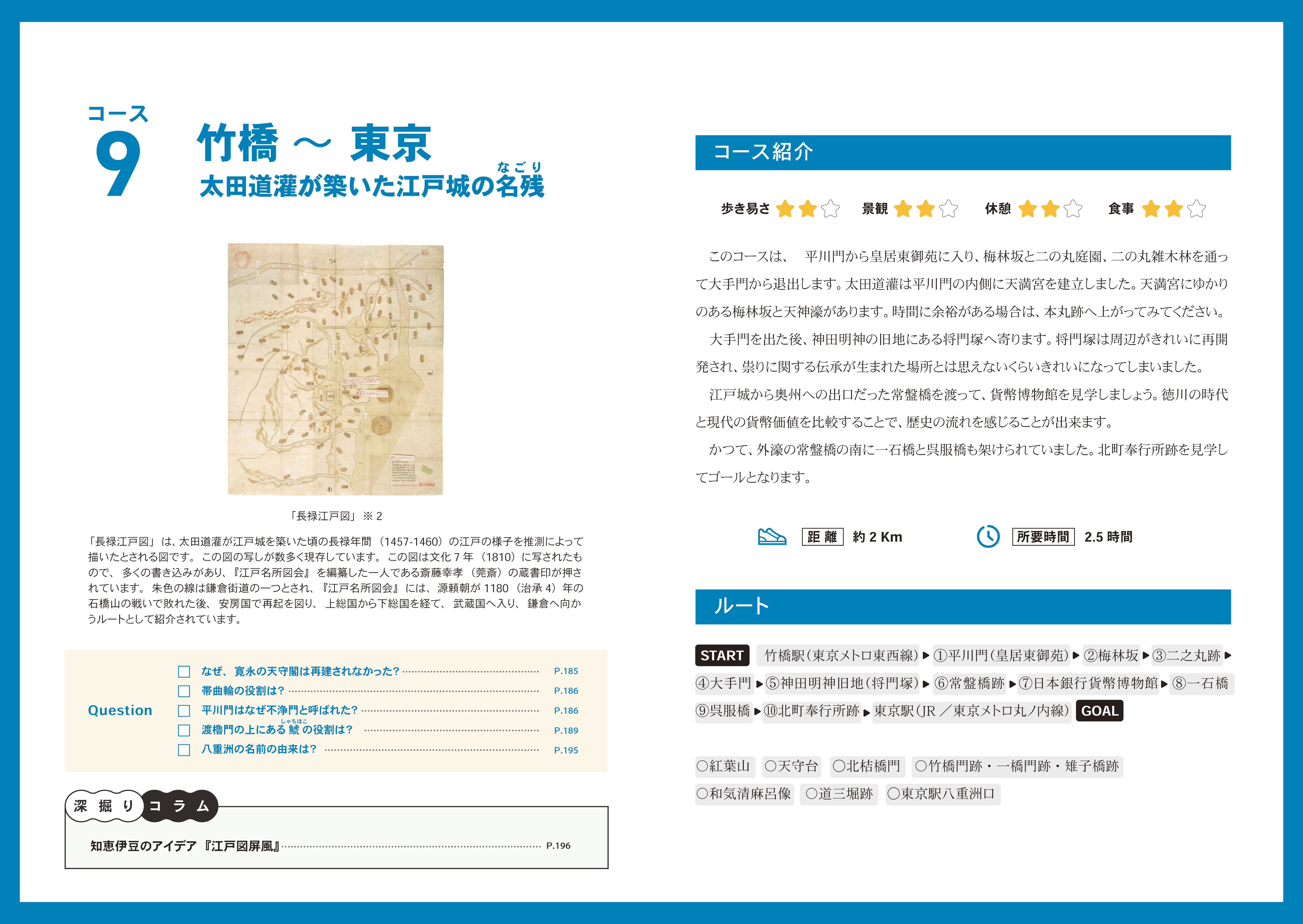 『訪江戸まち歩き 東京観光ガイドブックVol.Ⅰ』では、この「歴史の駅」をたどりながらまち歩きを楽しむことができるようにルートを設定しました。スタート地点をJRまたは地下鉄の駅で、2時間から2.5時間で回れます。ガイドブックの読者が自分でルートをアレンジできるように、ルート外の「歴史の駅」も紹介しています。