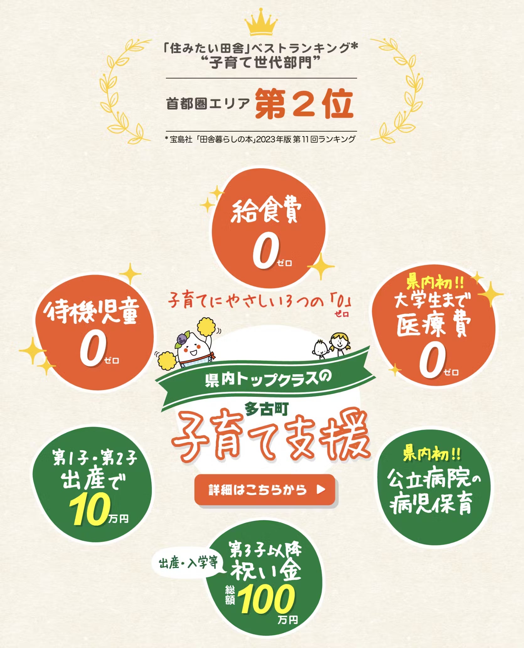 この課題に立ち向かうべく、町全体で移住に関する取り組みを積極的に行っています。その結果、「住みたい田舎」ベストランキングの子育て世代部門ではなんと首都圏エリア第2位になるほど魅力を感じていただいています。