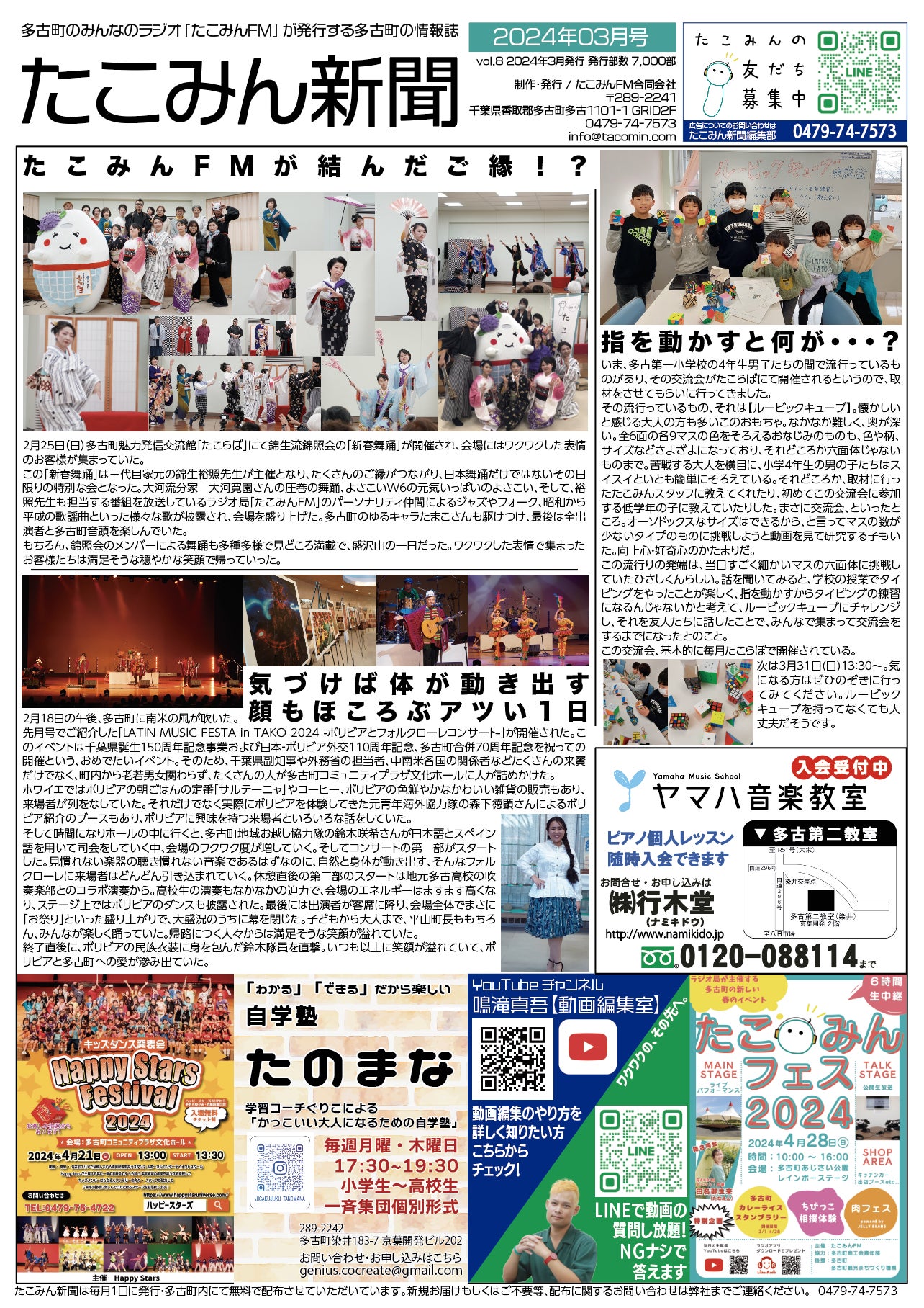 様々な活動をしているとはいえ、まだ1年も経過していないたこみんFMの認知は限られています。ラジオだけではなかなか情報をキャッチしていただけない方々にも情報をお届けできるよう、毎月7000部を発行するフリーペーパー「たこみん新聞」を制作しています。このフリーペーパーでは地域の子どもたちに関わる記事を中心に、多古町の求人情報やイベント情報を発信しています。
