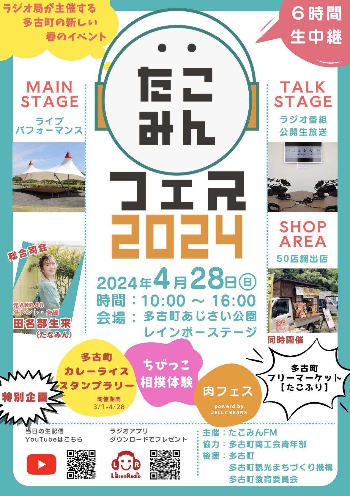 たこみんFMにパーソナリティやゲストとして参加してくださる方だけではなく、たこみんFMを受け入れてくださった多古町に住む方々や周辺地域の方々にも楽しんでいただきたい。多古町に関わる全ての方に参加していただき交流をさらに活性化させることを目的として、【たこみんフェス2024】を2024年4月28日(日)に多古町あじさい公園・レインボーステージにて開催いたします!