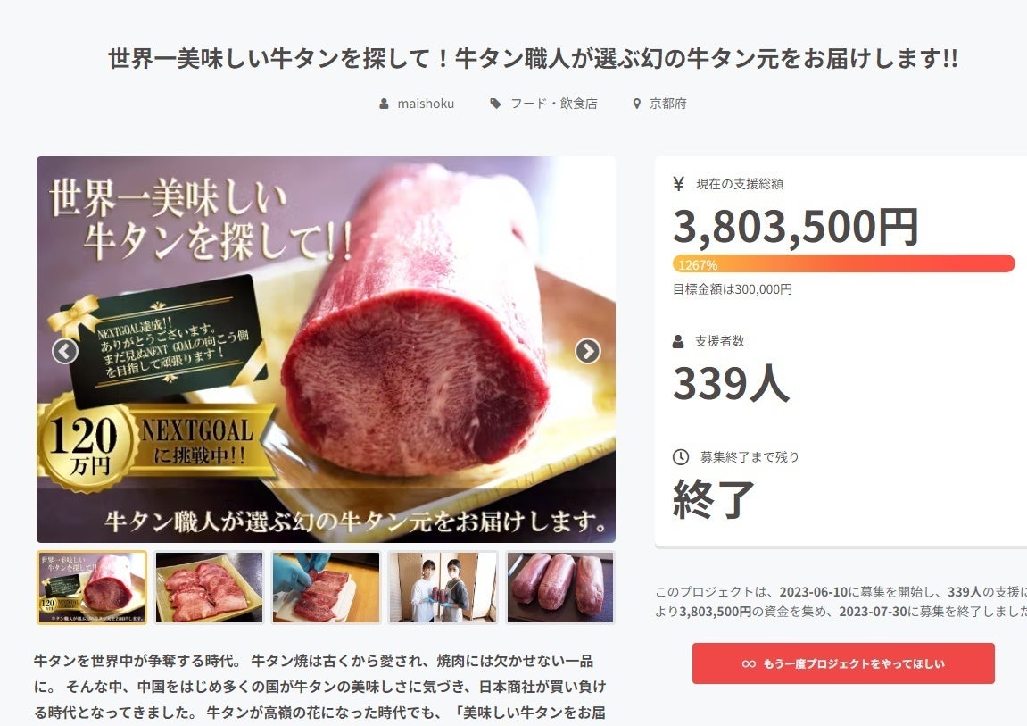 2025/05/17 14:06本日公開!【世界一美味しい牛タンを探して!牛タン職人が選ぶ幻の牛タン元をお届けします!!第4弾】いよいよSTARTしました。お昼ごろにこそッとそわそわしながらページを覗きに行くともう5名の方がご支援してくださってるーーー!!ご支援者様、ありがとうございます。今回のプロジェクトも目玉は「丸々1本の牛タンブロック」ですが、今のところ人気の商品は「霜降り牛タンスライス1.8㎏」のようですね。どの商品の人気がのびていくのか今後の展開からも目が離せません♪しかもリピータのご支援者様の温かい応援コメントが嬉しいです!!リピートしていただけるだけでも嬉しいのに、わざわざ嬉しいコメントまで残していただけるなんて。いつもこちらが皆様から牛タン笑顔をいただいてばかりです。ありがとうございます^^プロジェクトは始まったばかりです。皆様の温かいご支援、シェアなどの応援もどうぞよろしくお願いいたします。『世界一美味しい牛タンを探して!!』 ~牛タン職人が選ぶ幻の牛タン元をお届けします。~ もっと見る