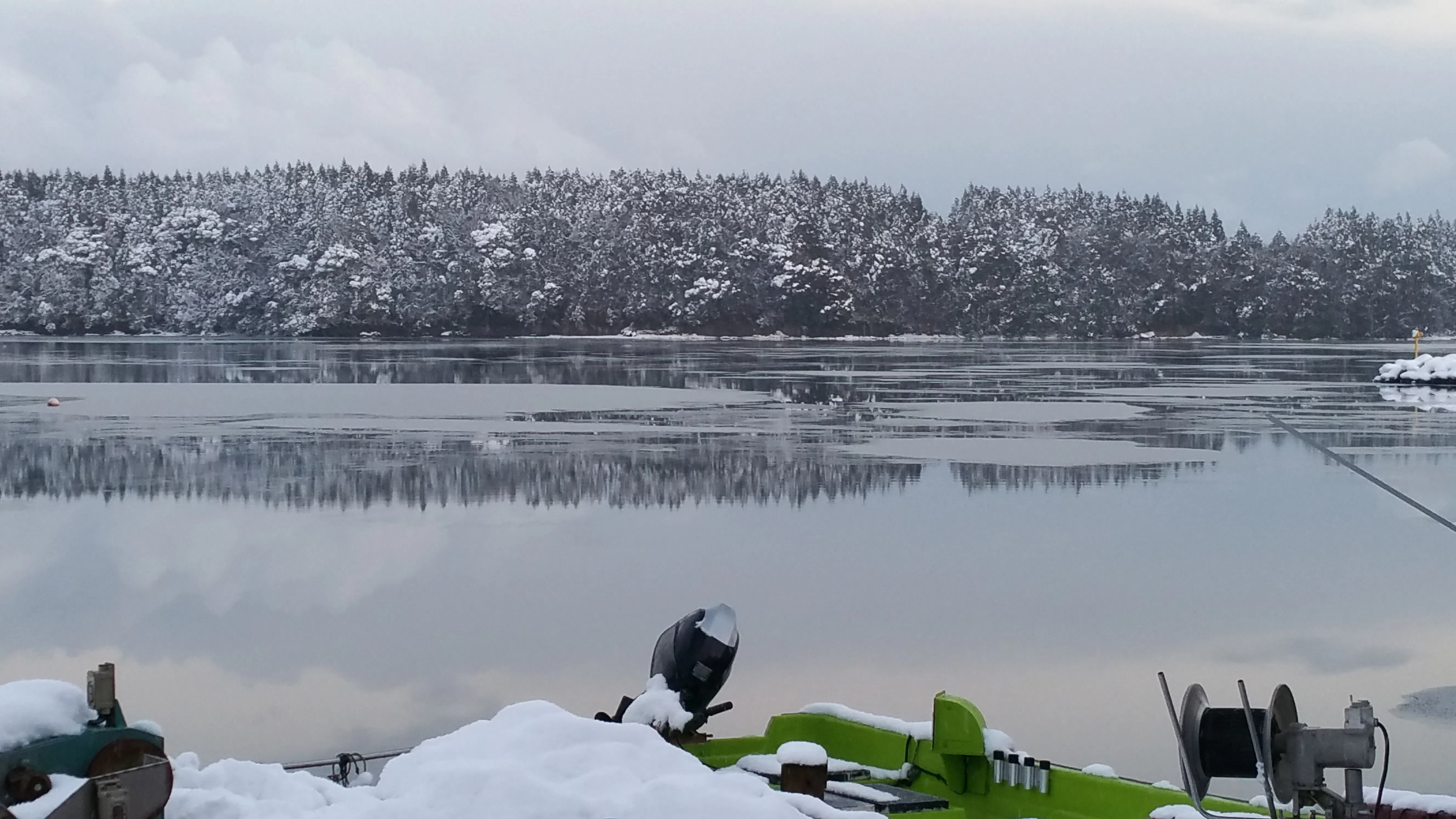 穴水町は毎年雪中ジャンボ牡蠣まつりが行われ、能登牡蠣が特産物となっています。去年はコロナで牡蠣まつりが中止になり、今年は牡蠣の数が足りずに中止となってしまいましたが、毎年たくさんの方が町外から牡蠣を食べに来られます。そんな牡蠣が育まれる穴水湾は波穏やかで、まるで湖のようです。