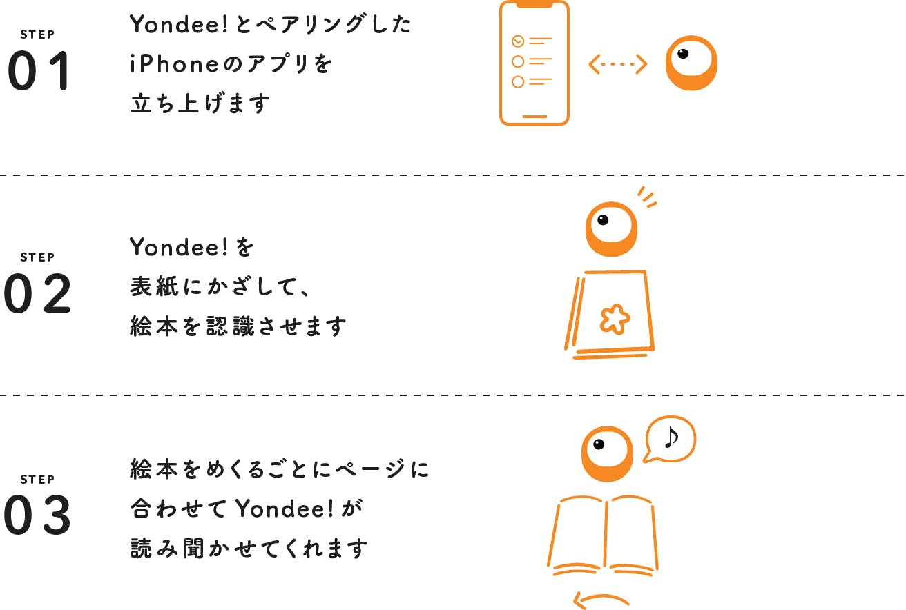 Yondee!は、紙の絵本をハンズフリーで自動読み聞かせしてくれるウェアラブルデバイスとアプリのサービスです。絵本の紙面をYondee!デバイスのカメラが認識し、内臓スピーカーからタイムリーに読み聞かせ音声が流れます。