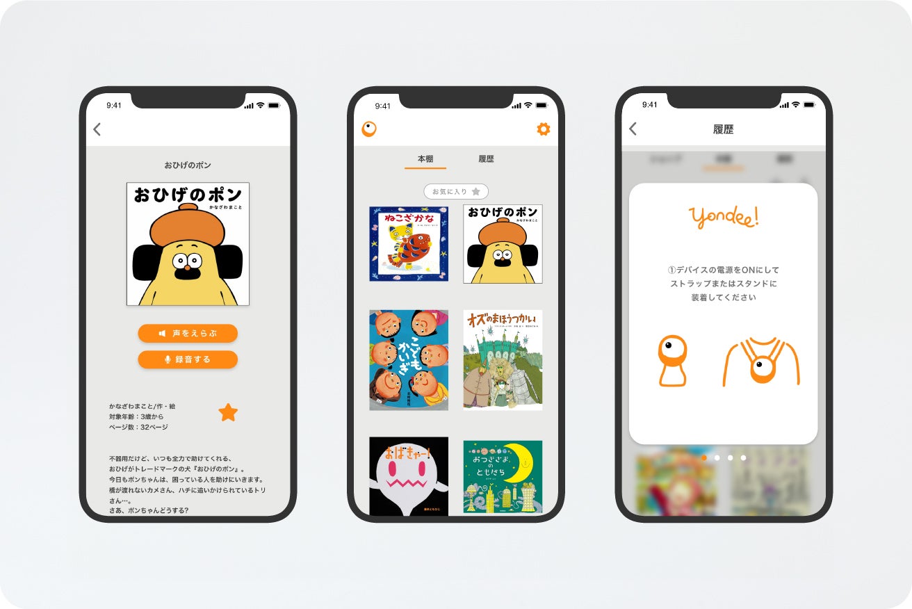 Yondee!は、紙の絵本をハンズフリーで自動読み聞かせしてくれるウェアラブルデバイスとアプリのサービスです。絵本の紙面をYondee!デバイスのカメラが認識し、内臓スピーカーからタイムリーに読み聞かせ音声が流れます。