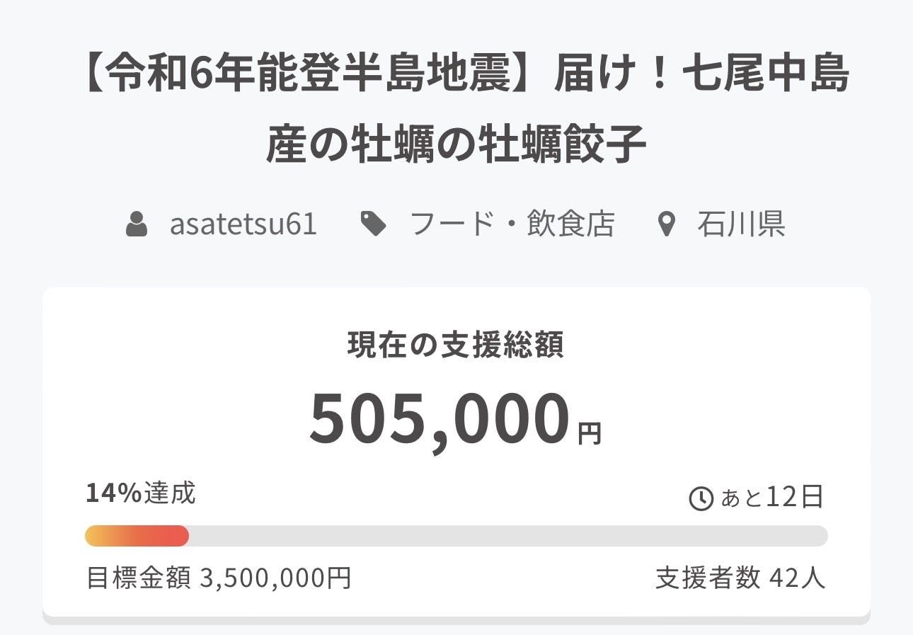 今日は僕の話ではなく同じ七尾の友達のケーキ屋さんのお話しです、僕が七尾に来て一番最初に僕の事を友達と言ってくれてSNSに載せてくれた友達、その友達のケーキ屋さんは今回の地震でお店が被災し、そしてクラウドファンディングを始め、つい先日目標達成して終了したんです、本当に凄いなーって思いました。いつも笑顔で本当に凄い良い人なんです、今年の11月1日が10周年記念で僕はいつもいつも色々してもらっていて、この10周年こそは何かをしたいと昨年から思っていました。お店が再オープンした時には今はまだこれしか浮かんでないですが、お花を直接持って行こうと思っています。そして昨日…ふと買い物の途中にその友達に道端で会って話したんですが話してる時に何人かの人が横を通ると、この人もこの人もという感じで知り合い?らしく会釈していました、まるで芸能人かのように輝いて僕には見えて移住した僕の事を友達ってスッと言える、こんな友達に七尾で出会えて良かったです。地震あってから結構お客様から移住したのにねって言われる事多いですが僕自身は今もして良かったって思ってるんです。長くなりましたが昨日、皆様のおかげで50万を達成して本当に感謝しております、さらに明日よりキャンプさんの広告に載るとメールが来ました、あと12日応援よろしくお願いいたします。※元気な顔?食べてる顔載せます。