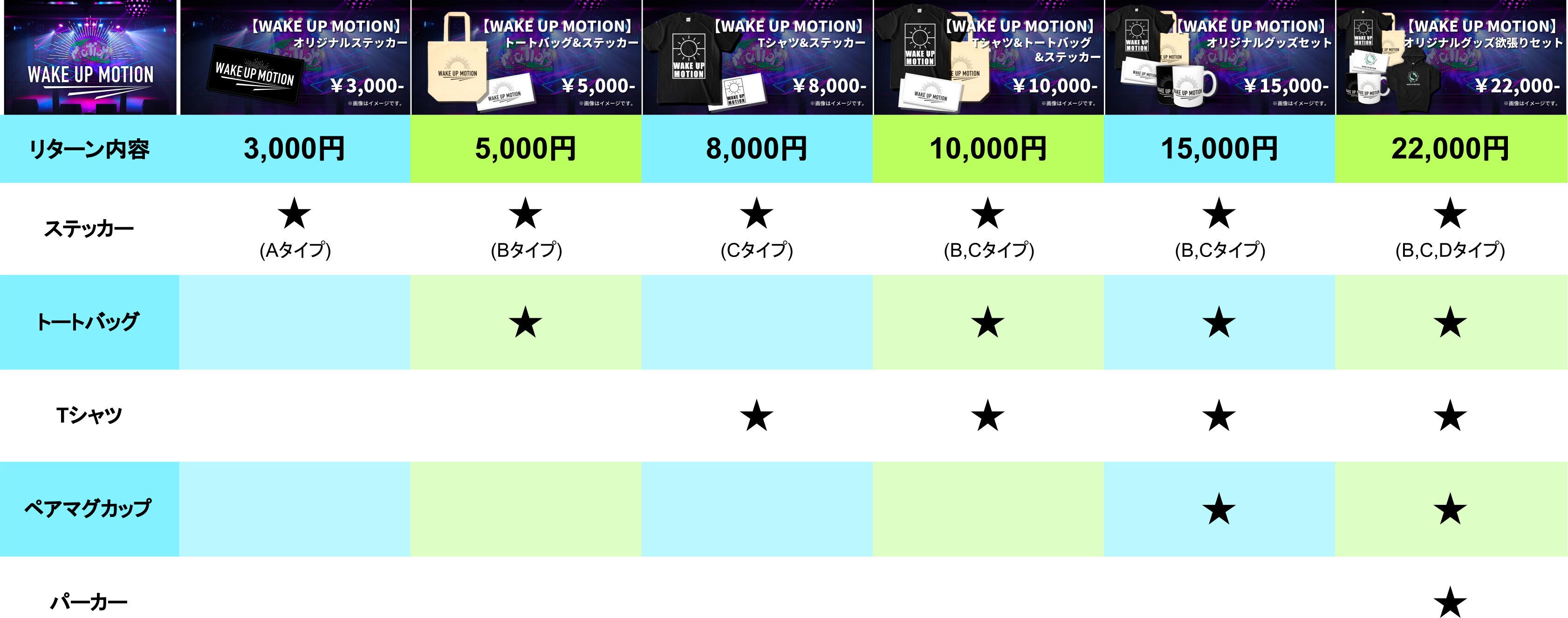 皆さんへのご支援へのお返しとして、このプロジェクト「WAKE UP MOTION」の名前を冠したグッズを用意しました!