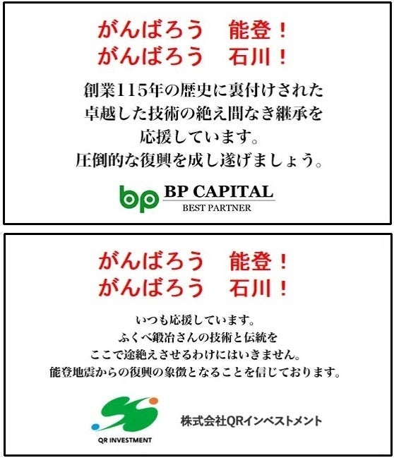 BPキャピタル株式会社様、株式会社QRインベストメント様から応援メッセージを
