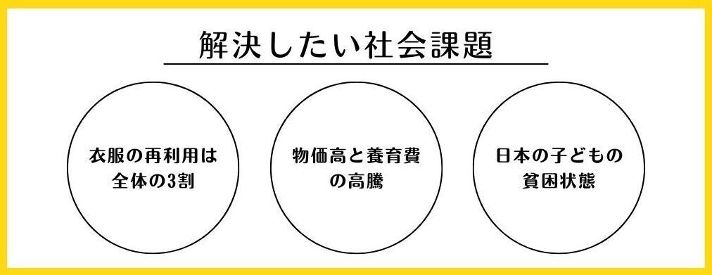 上記の社会課題より、子育て世帯は非常に生活が大変で、少しでも切り詰めたいと考えます。それが少子化の要因の1つになっています。無駄に捨てられる子供服を「今必要としている子供達に届ける」ことが必要とであると考えました。