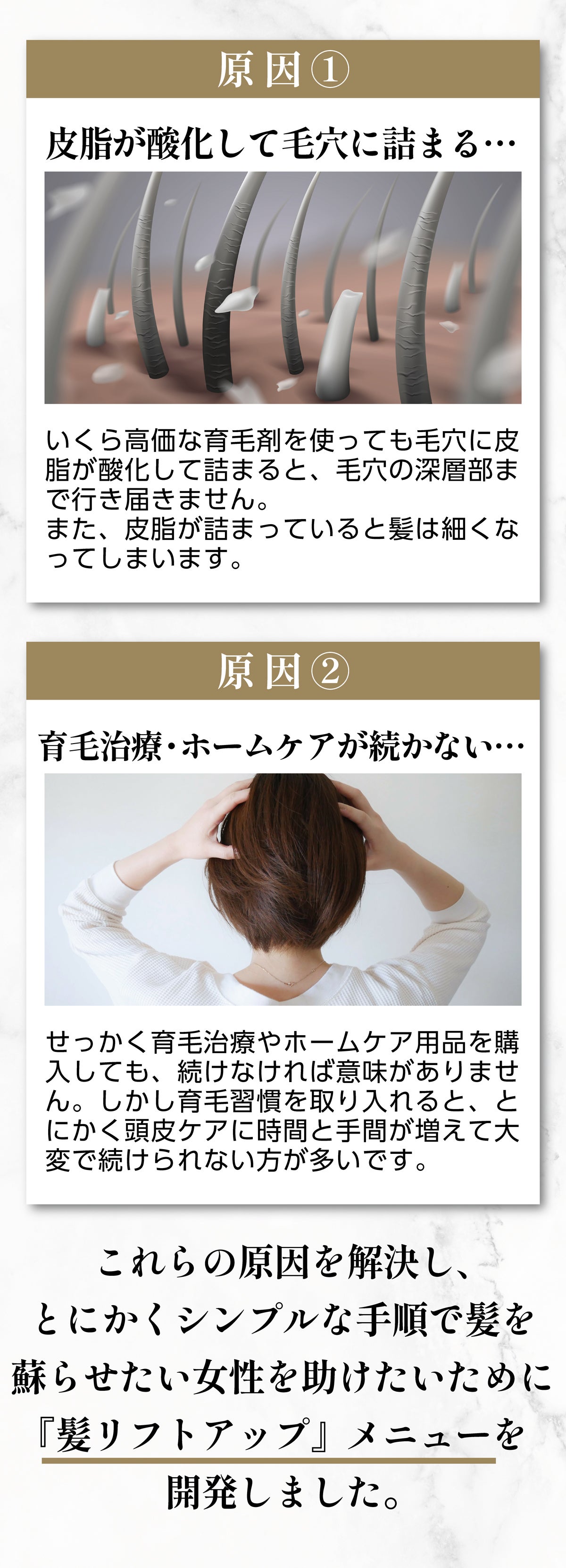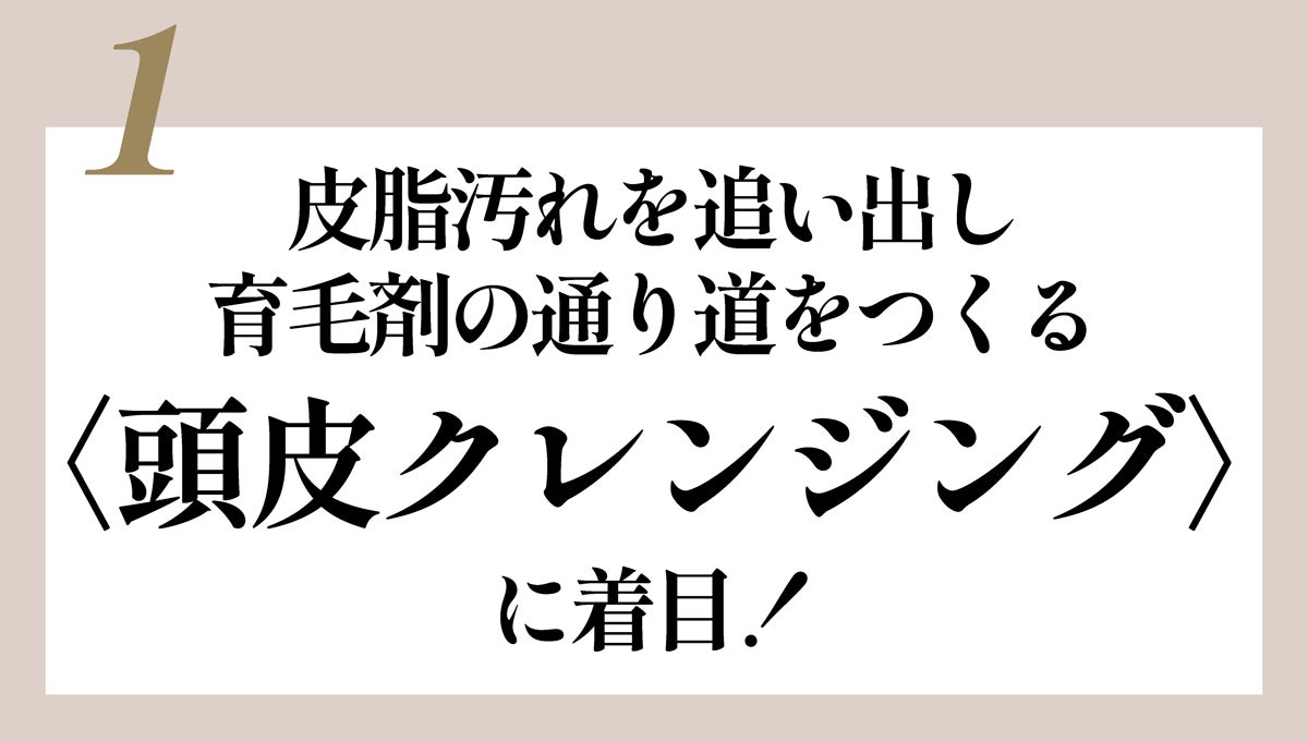 上記2つの原因を考慮し、〈頭皮のクレンジング〉によるいつもと変わらないシャンプーに着目したまったく新しい育毛プランです。