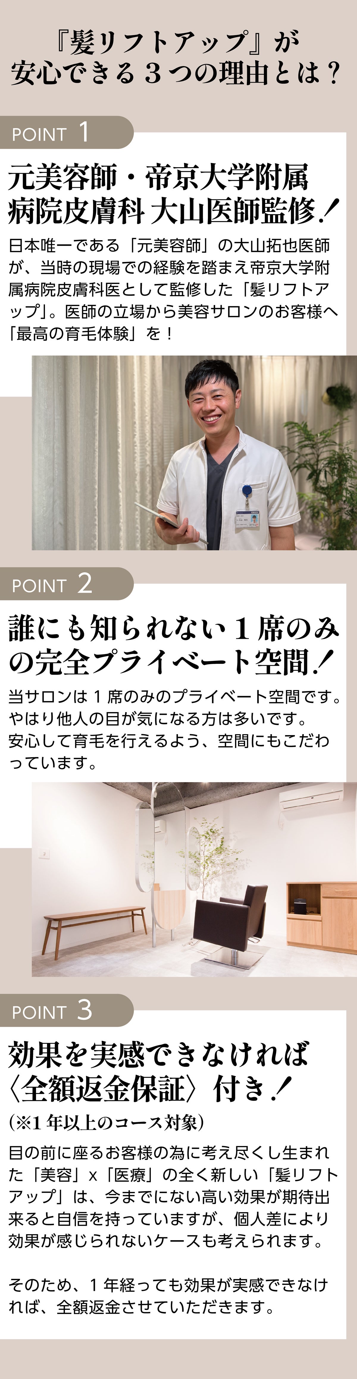 それでは根本解決にならないと思い、元美容師の皮膚科医・大山医師とともに研究開発し、「本当の意味で」お客様に寄り添った育毛プランが完成しました。