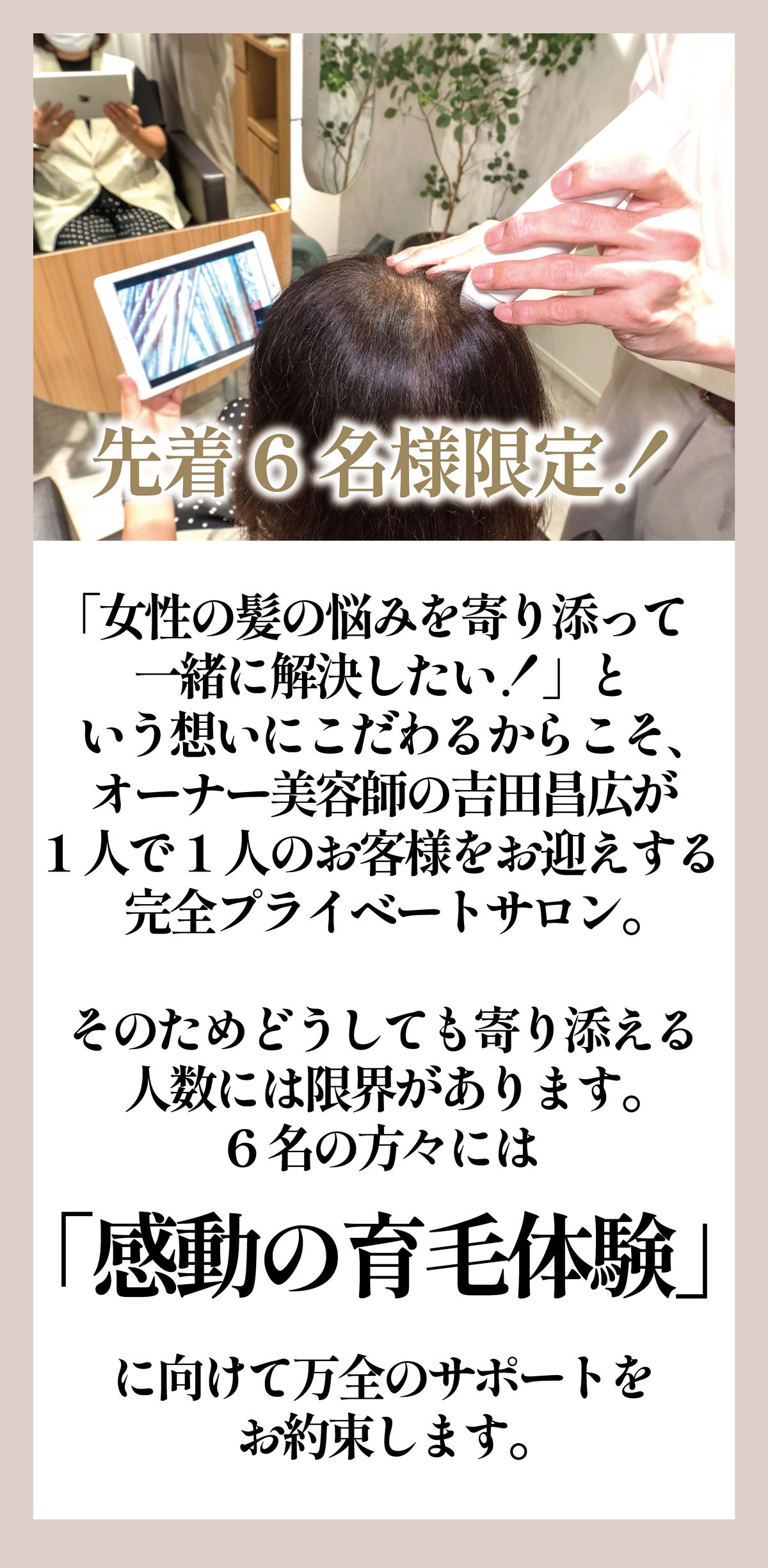 美容師と皮膚科医が力を合わせてできた育毛プランを薄毛や髪のボリュームダウンにに悩む女性へ届けたいです。