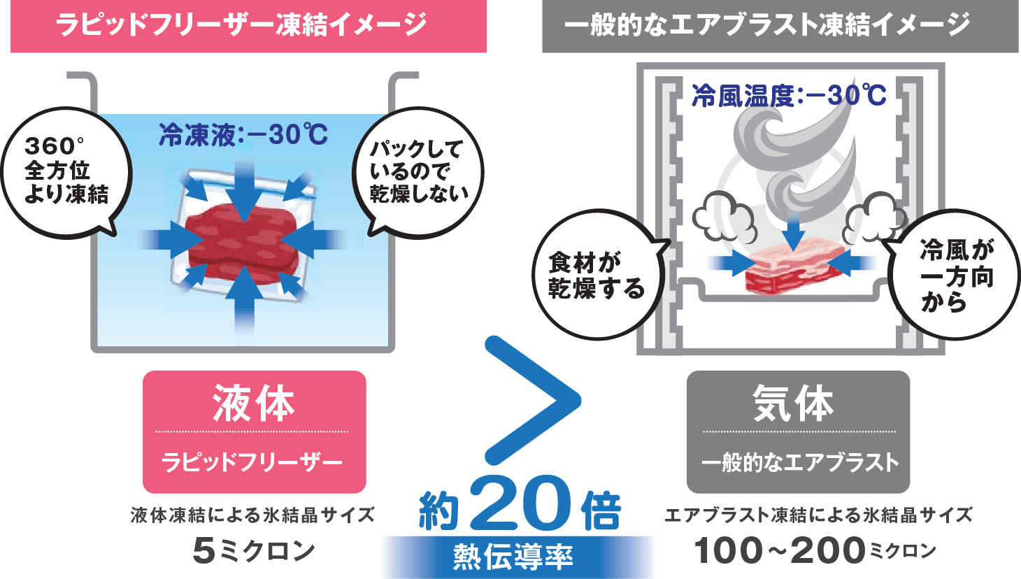 一方でラピットフリーザーでの冷凍の場合は、熱伝導性の高い溶液を使い冷凍するため、一般的な冷凍庫で冷凍するより約20倍の速さで冷凍することが可能です。これにより肉の中に結晶を生成する温度帯を素早く通過することができ、ドリップの原因となっている結晶の発生を最大限防ぐことができます。