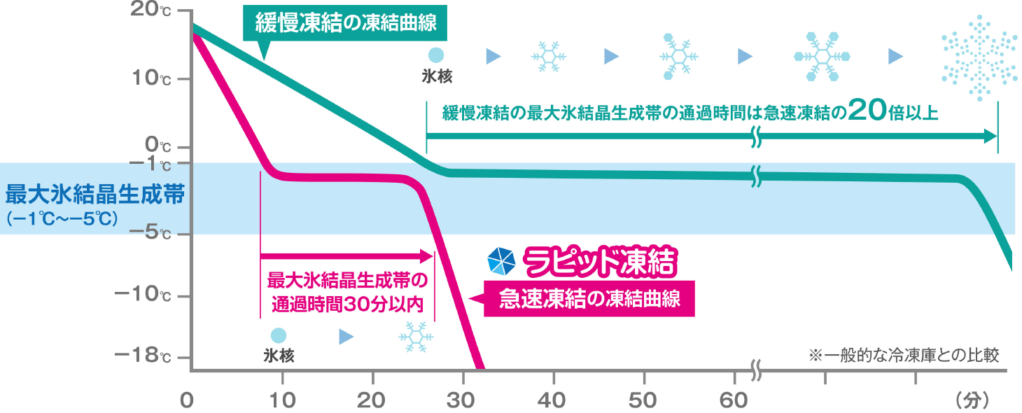 一般的な冷凍庫で冷凍した肉を解凍すると、ドリップが出て肉のうま味が流出してしまいます。またドリップが出ることで肉がただれてしまい、歩留まりが悪くなってしまいます。これは冷凍する過程で肉の内部の細胞壁が破壊され、結晶ができてしまうことが要因となっております。通常の冷凍庫での冷凍では結晶を精製する温度帯(-1℃~-5℃)に馬肉が長く留まってしまうため、肉の中に多くの結晶ができてしまいます。