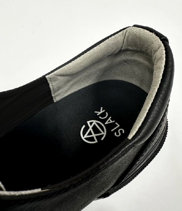 今回はこの部分に起毛素材を採用しました。つるつると滑りにくく、引っ掛かりやすくなっています!!パッと見た時に黒とグレーの切り返しが気になる方もいるかもしれませんが、これは狙いでデザインしています。起毛素材の黒は非常に色落ちが激しい為、白いソックスなどに黒の汚れが付着しやすいのでグレーにしています。またこの部分を「すべり」と呼びます。
