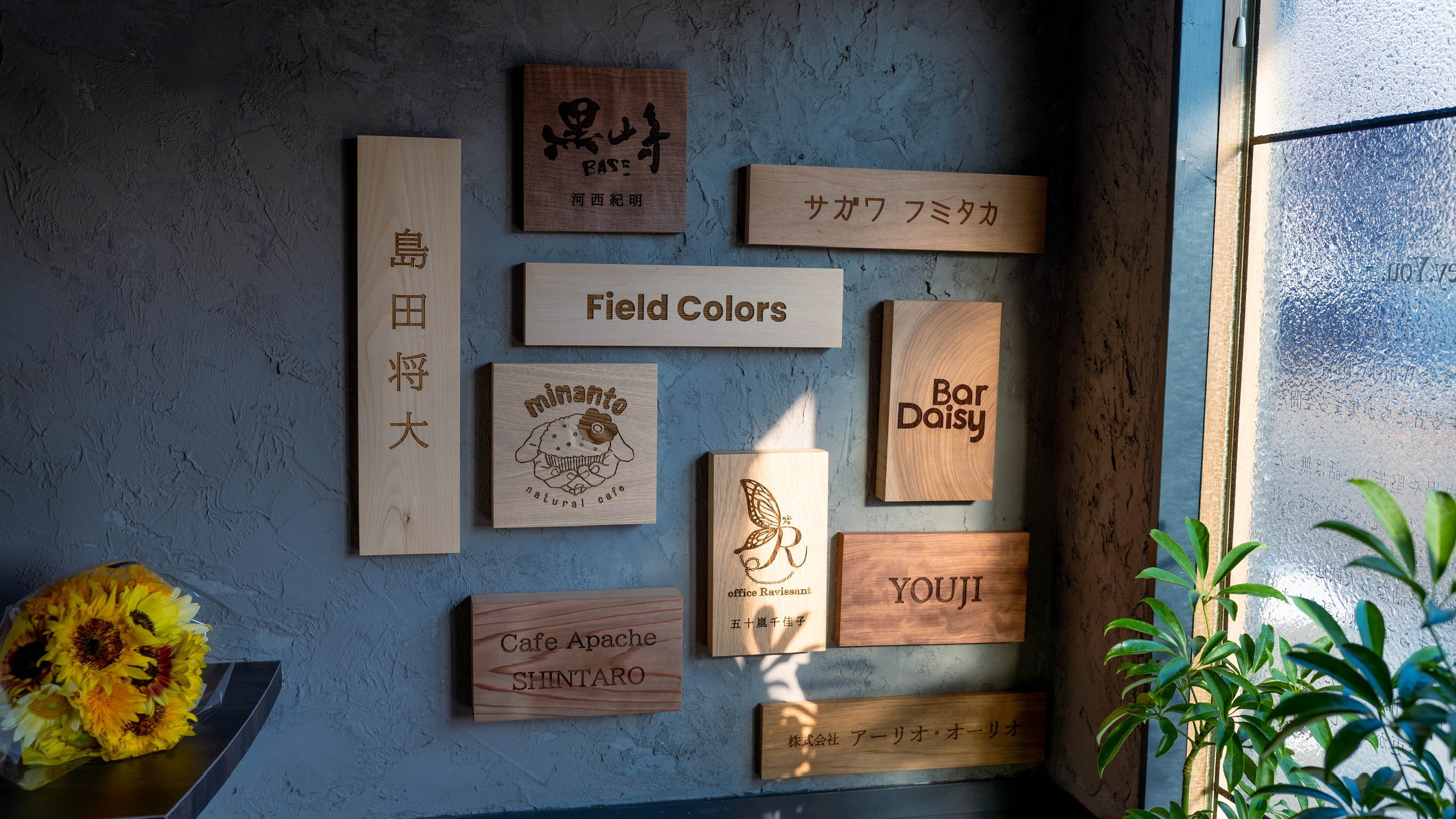 ①支援者様の名前入り記念表札・・・店内に来られるお客様に見ていただける表札のような木彫り板。