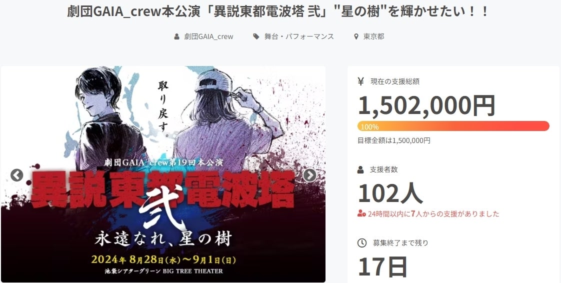 劇団GAIA_crewです。ぞくちょ老人会プレゼンツ GAIA_crew第19回本公演『異説 東都電波塔 弐 〜 永遠なれ、星の樹』https://gaiacrew.com/sp/toto-tower_2nd/たくさんのご支援を頂きました本公演 は、キャストスタッフ一同怪我なく終えることが出来ました。お客様からは多くのお褒めの言葉をいただき、これもご支援いただきました皆様のおかげでございます。改めて、心より御礼申し上げます。各種リターンにつきまして、担当より早急に対応をさせていただきますので、今しばらくお待ちいただければと存じます。引き続き何卒、よろしくお願いいたします。