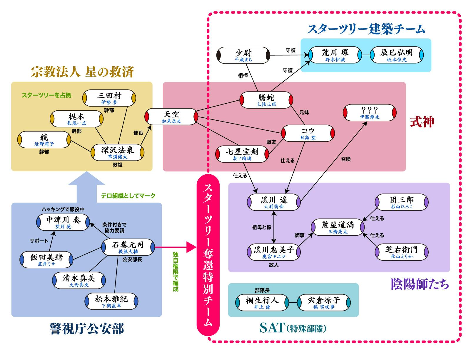 お供の式神である団三郎、芝右衛門、天后、そして生きる霊剣七星宝剣と共に現場に到着した一同の目の前に現れたのは、カルト教団「星の救済」の若き教祖深沢法泉。彼はこの塔を依り代として、ツリー全体を怨念を収束させる巨大な霊媒にするために占拠、クラッキングによる電脳と呪術を使ったテロ行為を実施したのだ。