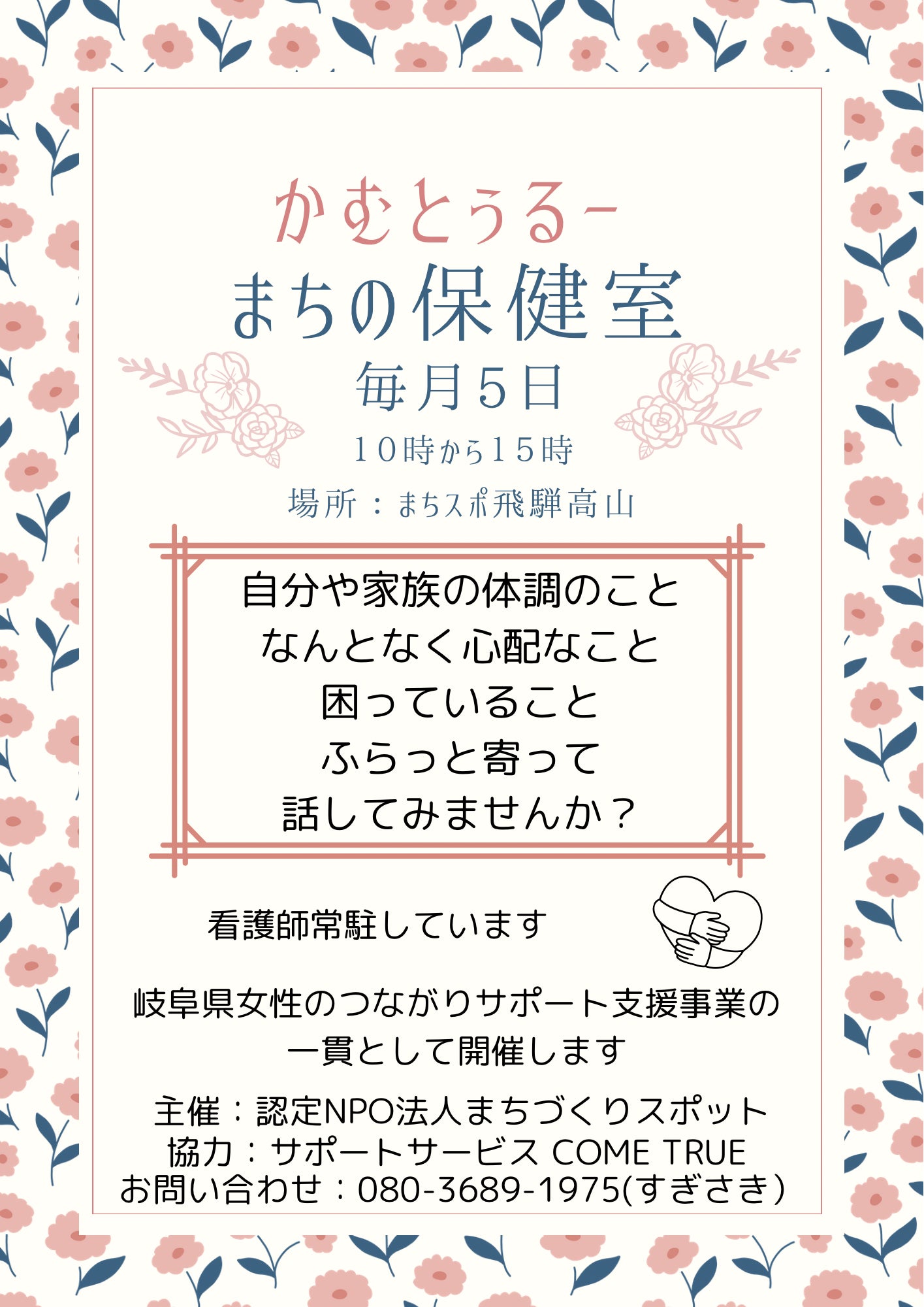 2024/03/18 11:14来月より<まちの保健室>として、地域の皆様に様々な情報共有、介護予防などできる場を作ることになりました。主催は、認定NPO法人まちづくりスポットです。無料で血圧測定、困りごと相談など行います。岐阜県女性のつながり事業の一環として行います。このような場に協力事業者として参加させていただけることを嬉しく思います。ここでの活動を元に、皆さんに知ってもらい、お役に立てればと思います。 もっと見る高山市社会福祉協議会会議の参加