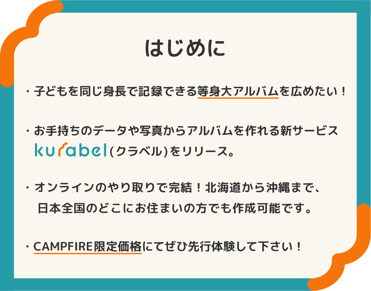 私たちは、子どもの成長をより楽しむためのツールとして、また自分の成長を実感するための手段として『等身大アルバム』を受け取って欲しいという思いでこのプロジェクトを立ち上げました。