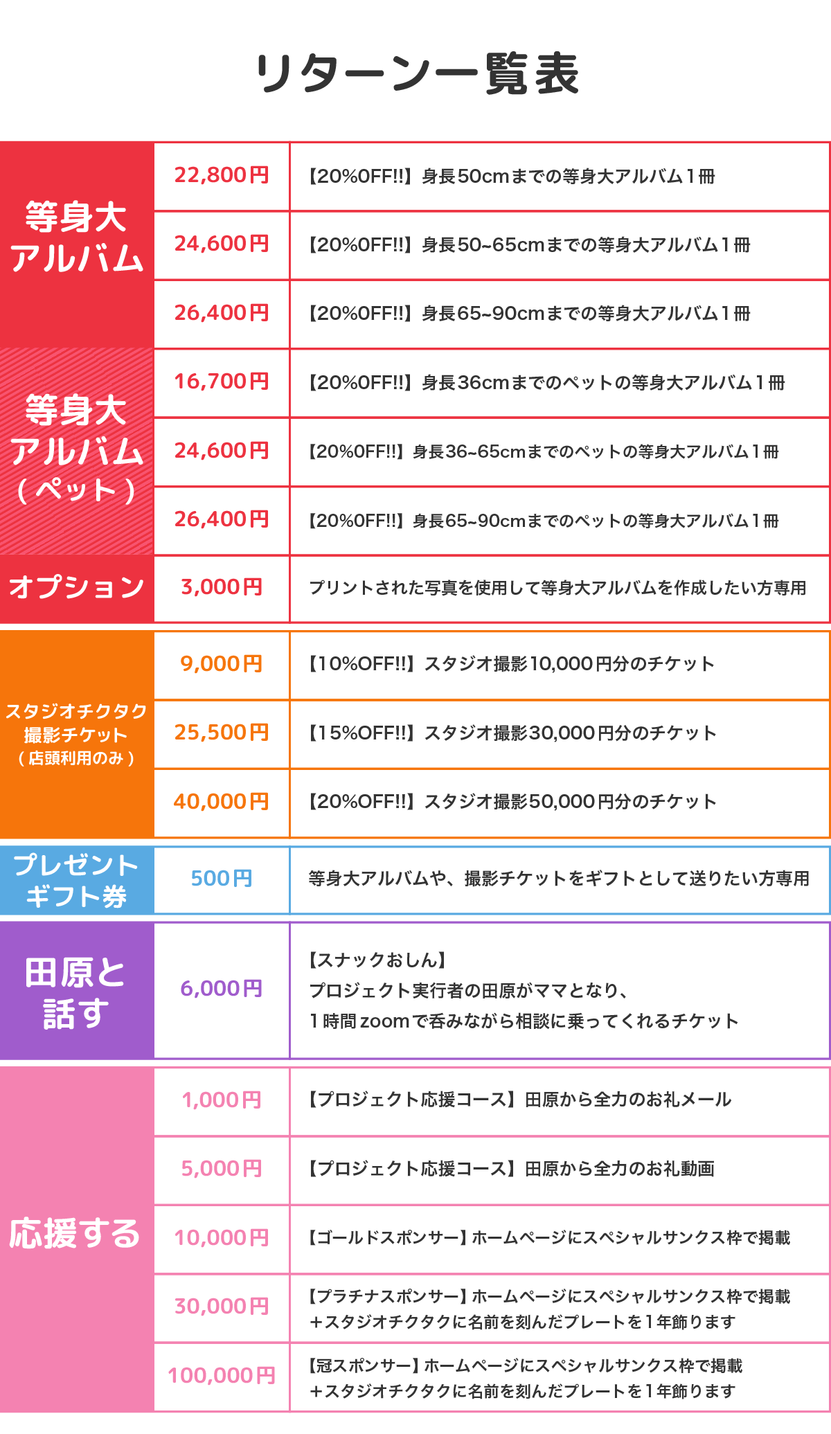 また、ご支援金額によっては、写真館での撮影料金の撮影チケットや、ZOOM相談室へのご招待もご用意しており、随時リターンも追加されます。