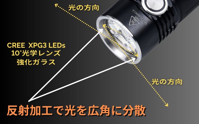 「P25」の超広角と明るさの秘密は4個のCREE XPG3 LEDsと10°光学レンズによる高い高透過率と、さらにレンズ周りの反射加工により光を広角に分散するからです。