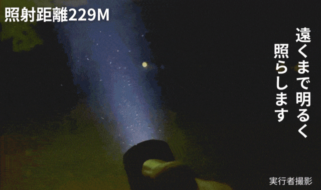 このサイズで高輝度3000ルーメン、照射距離229メートルの明るさ!暗闇を一瞬で遠くまで明るく照らします。