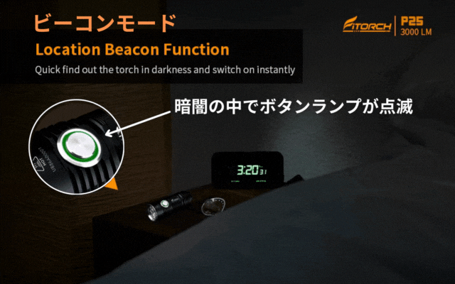 ビーコンモードではP25を枕元や分かり易いところに置いておけば、暗闇でもボタンの明かりが目印になりすぐ手に取れます。