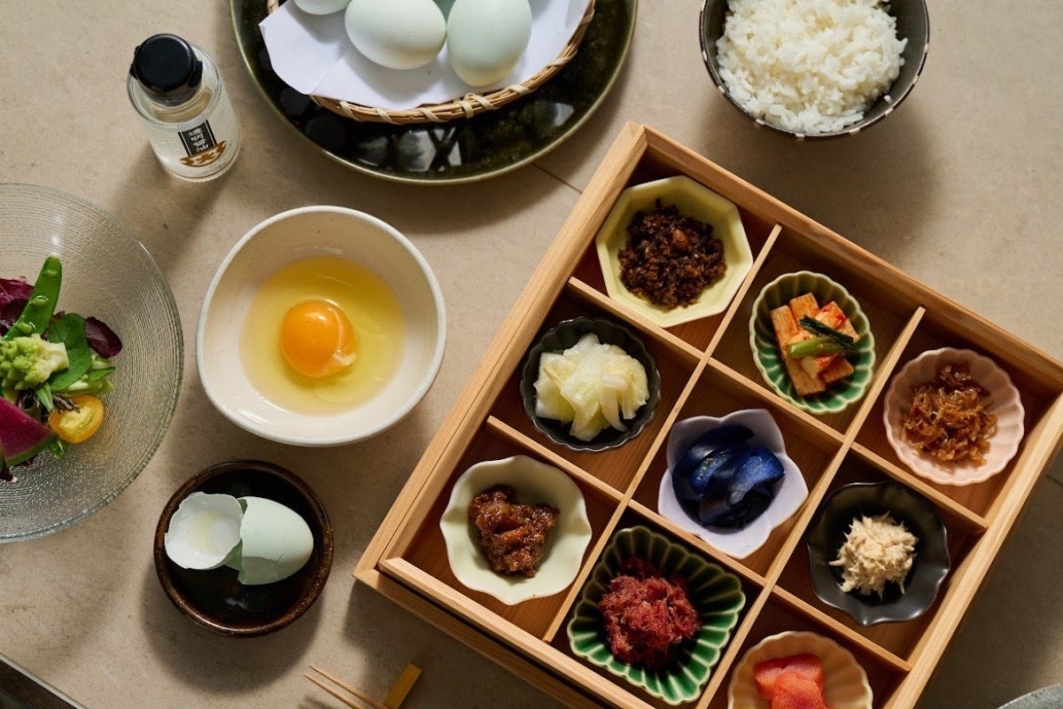 ・オーナーが厳選したご飯のおとも、アローカナの卵をはじめとする11種類のおかずがお米との相性抜群!まるでホテルの朝食のようです。