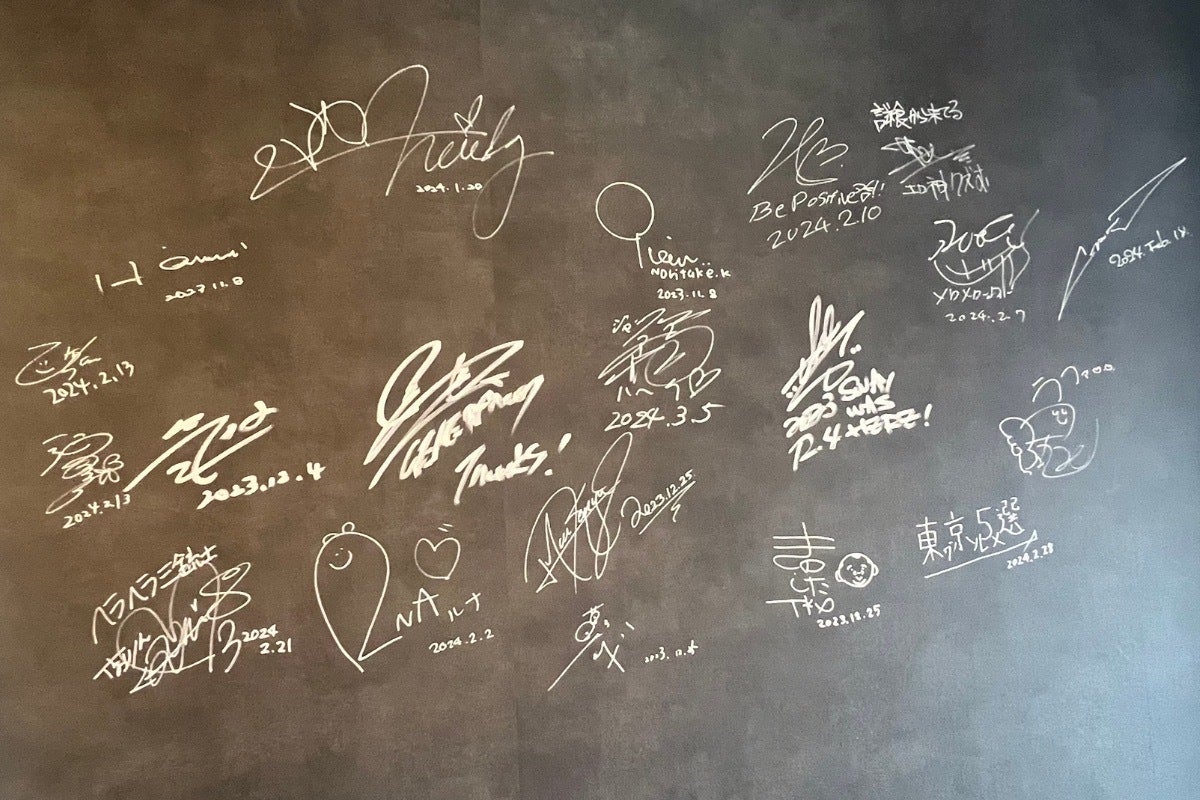 店内の壁紙にはご来店された芸能人の方々のサインがお迎え致します。