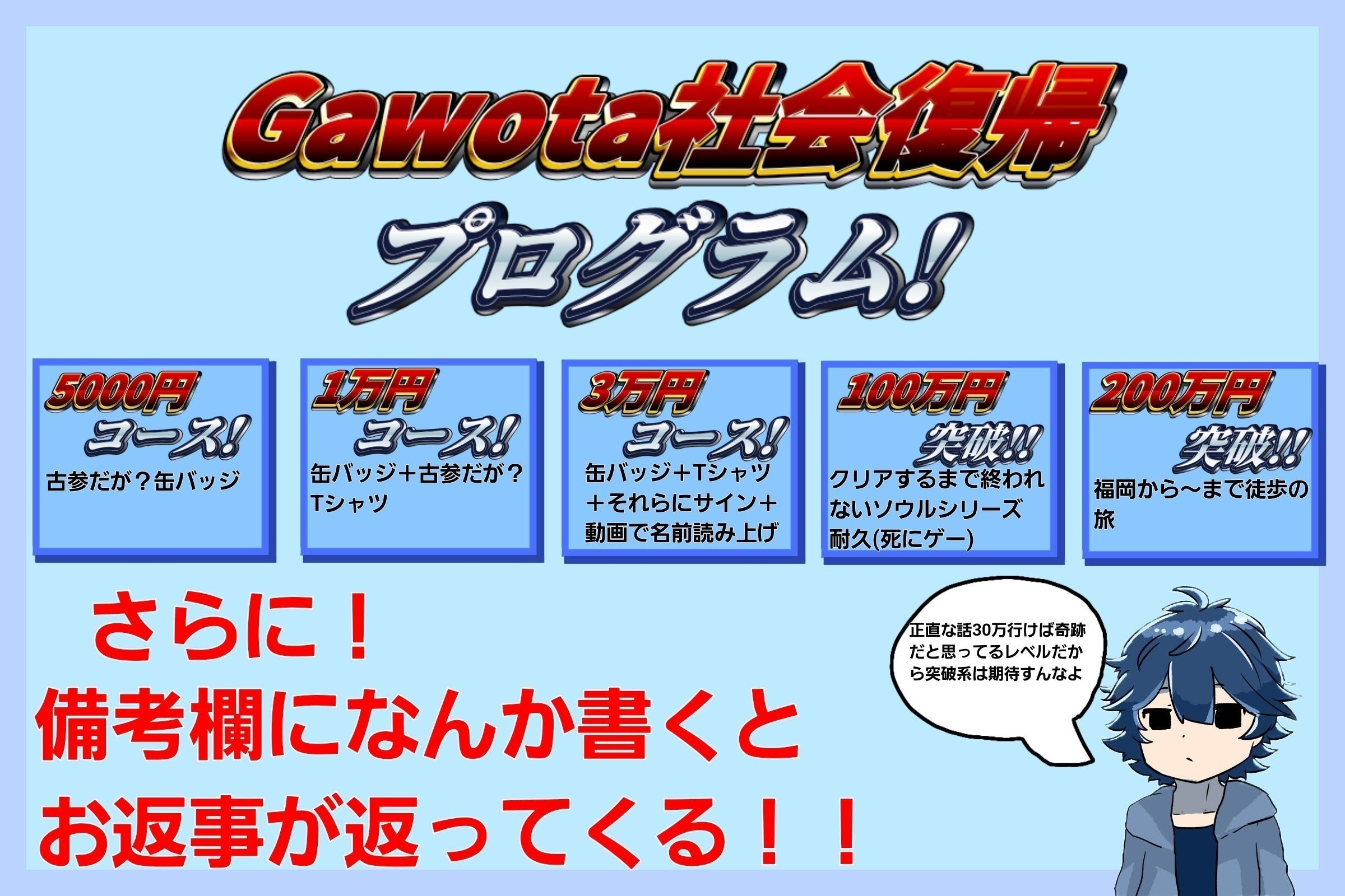 はい、俺が人気にならなければただのゴミです。すいません…でも俺も頑張るので協力してくれると嬉しいなぁ…あっ!備考欄に何か書いてくれたら手紙送り返しますよ!(要らない)リターンは2025年5月発送予定となっておりますが準備が出来次第、すぐに発送いたします!