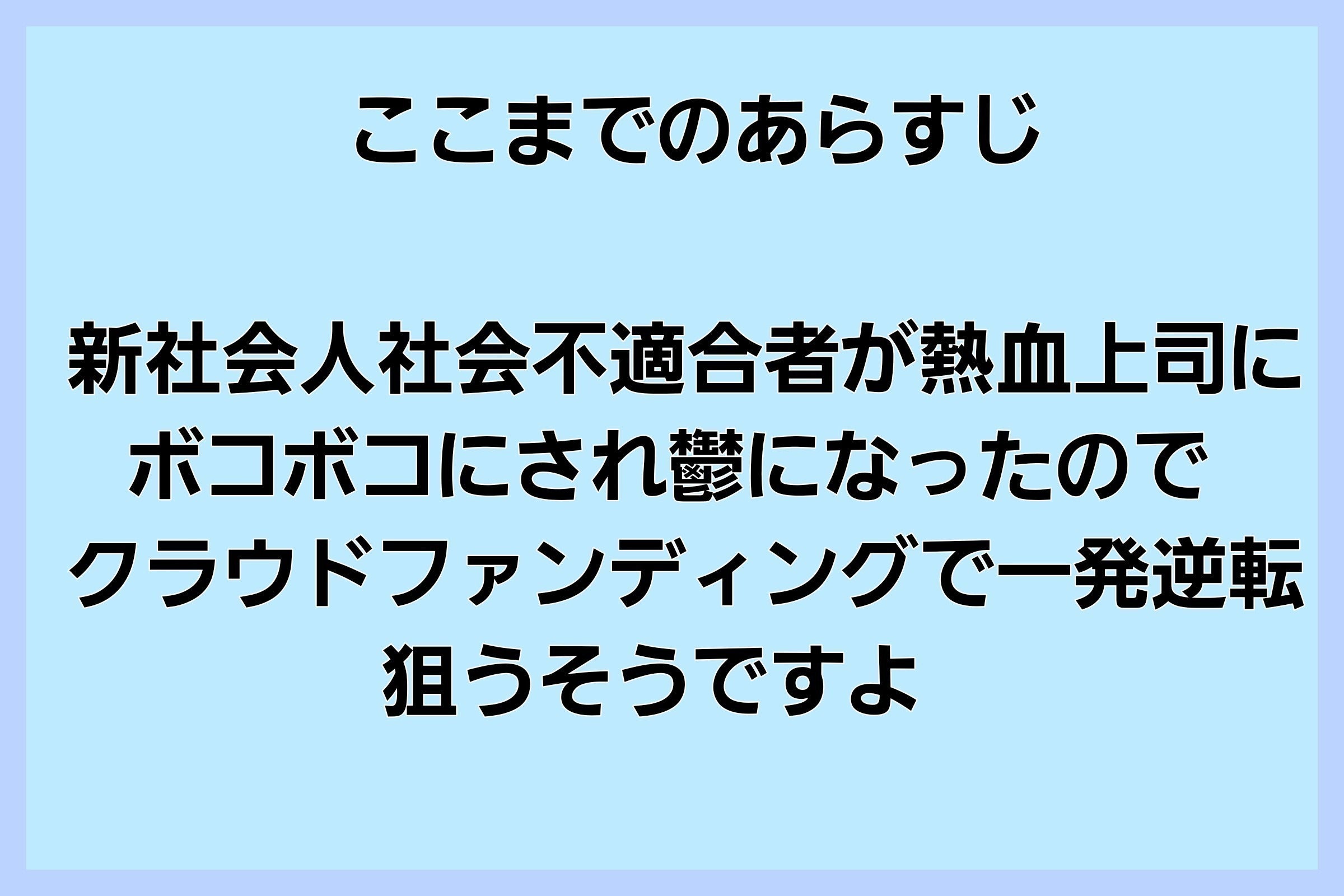 新社会人半年で熱血上司との相性が悪く鬱を患い無職に、親からも「頼むから死ぬのだけはやめてくれ」と言われただ生きる人生。バイトは始めたけど生きがいは感じず、 とりあえず夢を追いかけるくらいしか今の人生に意味を見い出せないのでクラウドファンディングで皆さんに協力してもらえればと考えました。