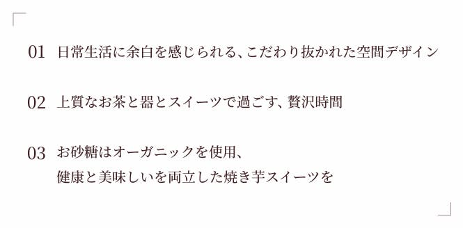 自宅でも、職場でもない、自分にとって「ホッとできる居場所を提供したい」。全国各地に直接足を運び、選び取ってきた茶葉や茶器を使用した焼き芋スイーツで、日常生活のなかで落ち着ける場所をご提供できるよう、空間や接客にもこだわりを持っています。