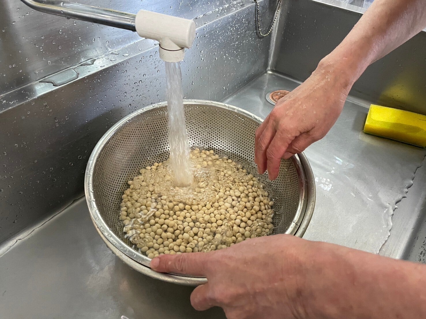 みそ作りは、前の日の大豆洗い、うるかす(水に浸しておく)から始まります。