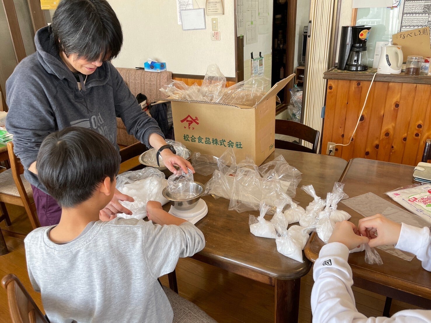 前泊した子どもたちも、麹(こうじ)と塩を量って家族ごとに分けてくれました。
