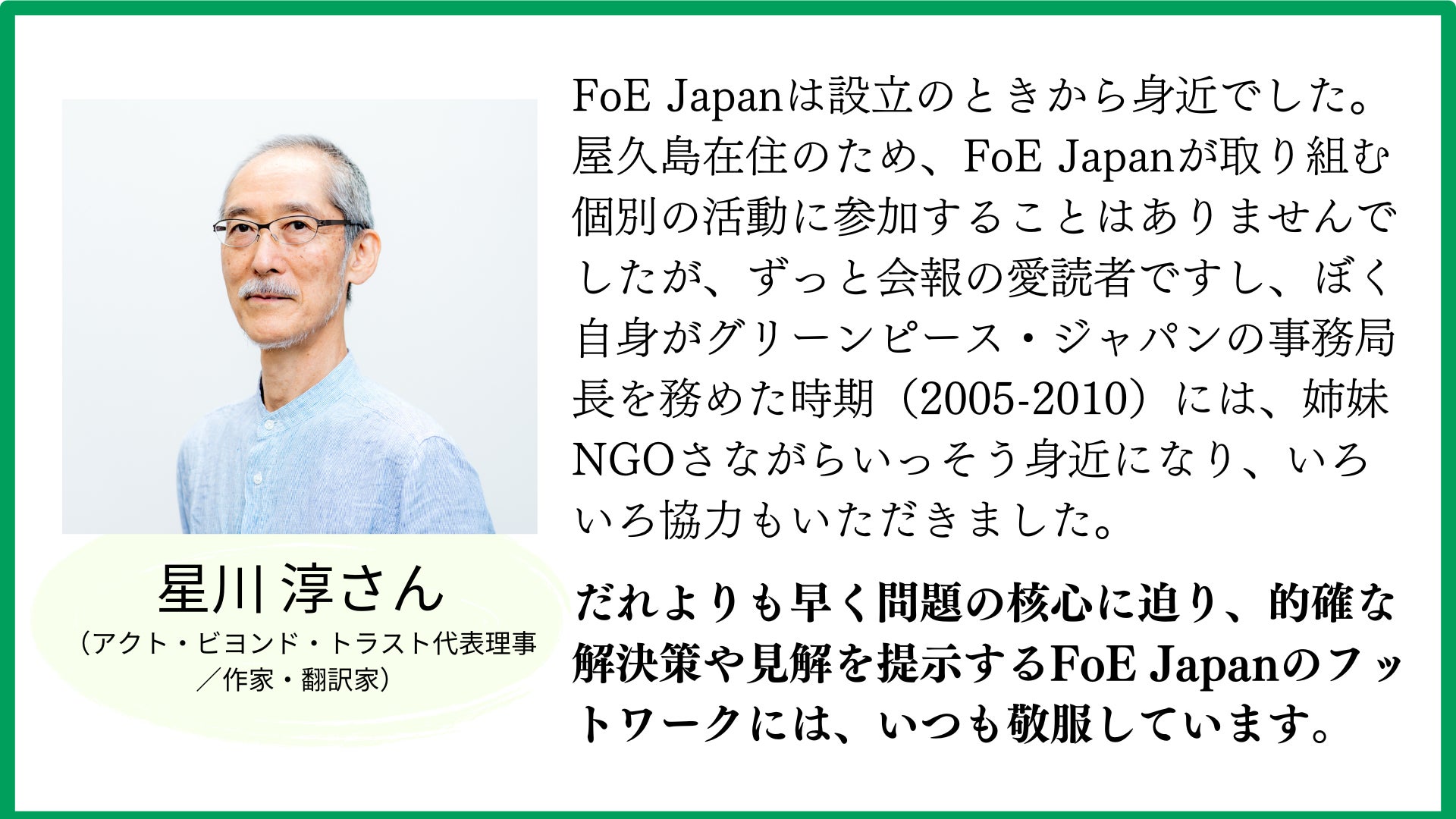 FoE Japanは設立のときから身近でした。屋久島在住のため、FoE Japanが取り組む個別の活動に参加することはありませんでしたが、ずっと会報の愛読者ですし、ぼく自身がグリーンピース・ジャパンの事務局長を務めた時期(2005-2010)には、姉妹NGOさながらいっそう身近になり、いろいろ協力もいただきました。