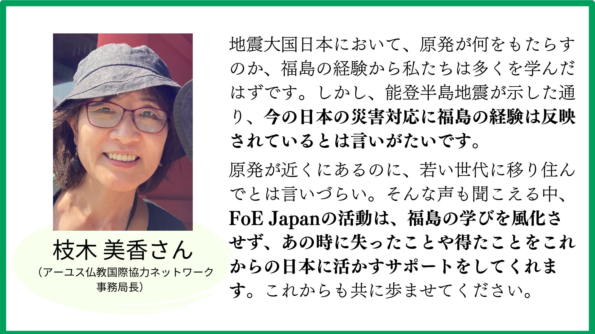 原発が近くにあるのに、若い世代に移り住んでとは言いづらい。そんな声も聞こえる中、FoE Japanの活動は、福島の学びを風化させず、あの時に失ったことや得たことをこれからの日本に活かすサポートをしてくれます。これからも共に歩ませてください。