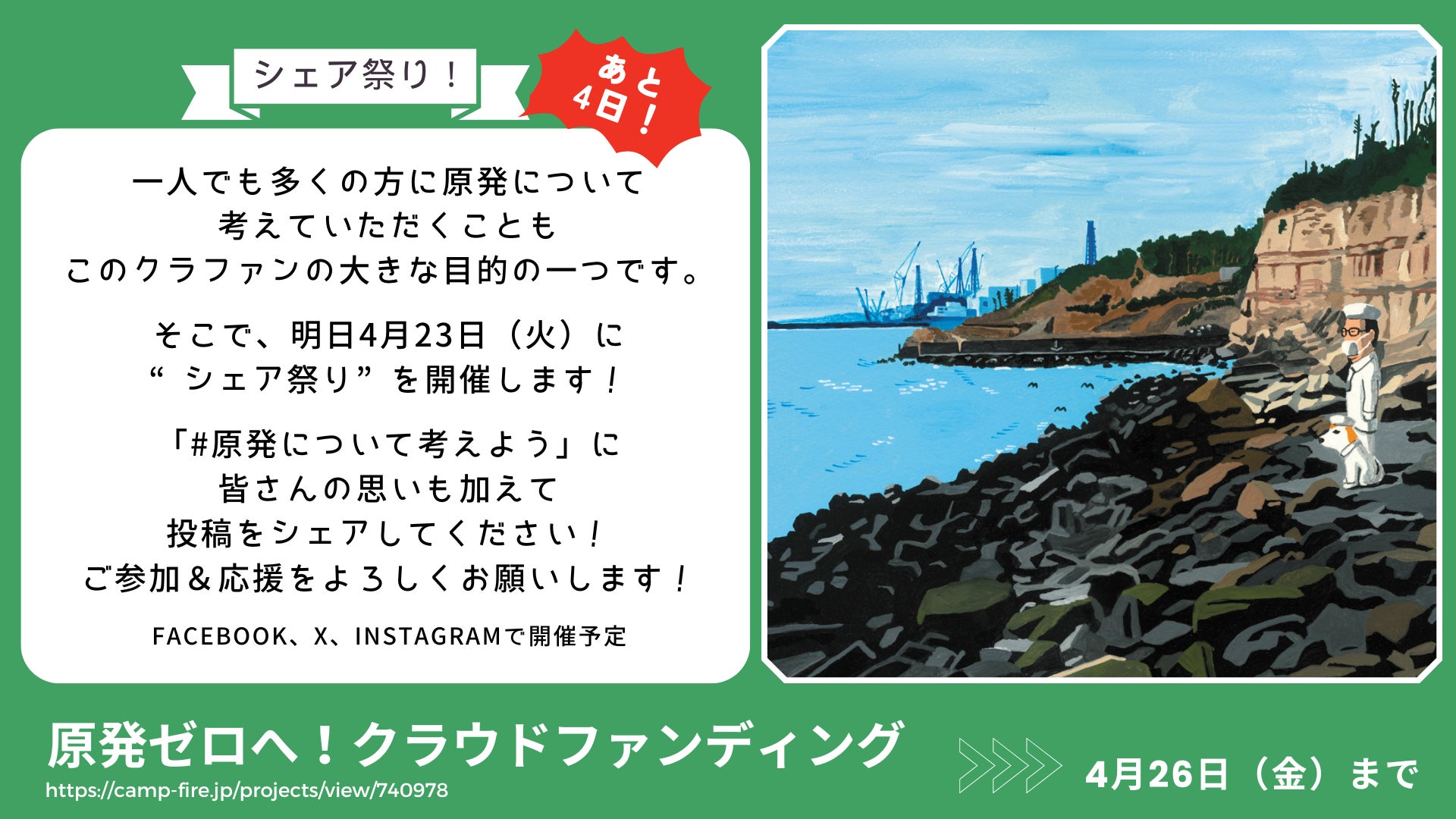 このクラファンでは、一人でも多くの方に原発について考えていただくことも大きな目的の一つとしています。そこで、”シェア祭り”を開催します!