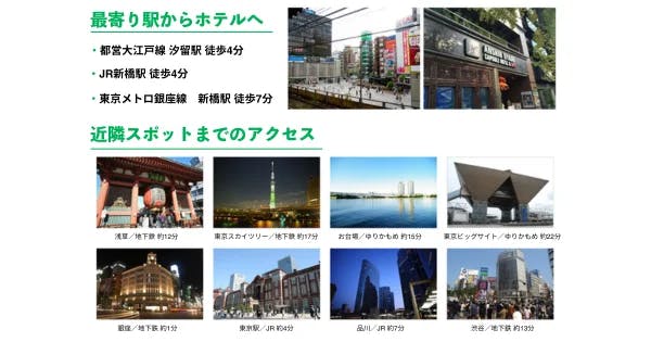 JR「新橋駅」烏森口・都営地下鉄「汐留駅」から徒歩4分。また、ホテルの前には都営バス「新橋五丁目」バス停があり、渋谷駅まで運行しています。下記主要駅までのアクセス情報は下記の通りです。