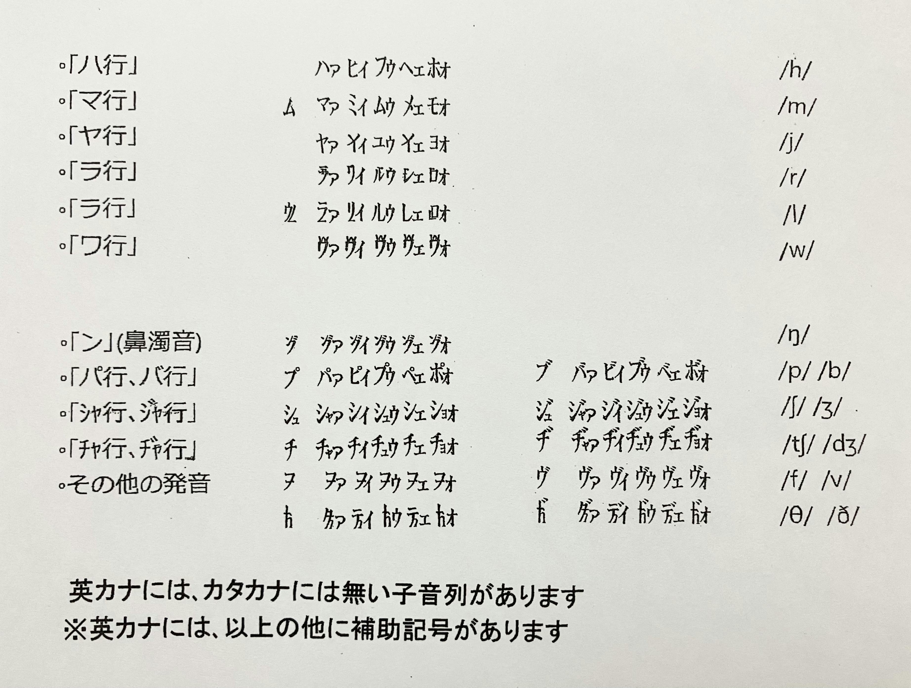 この表では、左側のカタカナと右側の英語の発音記号の間に、「英カナ」という半角のカタカナをベースにした英語の個々の発音を正確に表記できる記号を入れました。