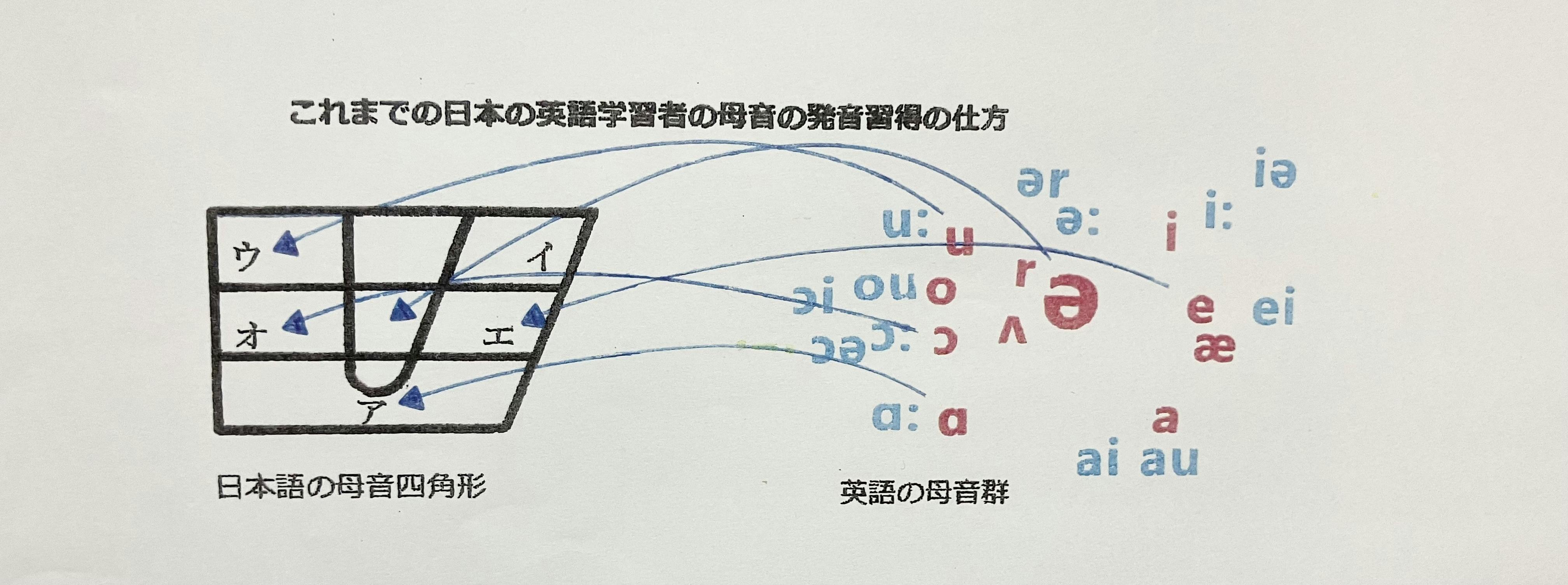 (これまでの一般的な発音の習得は、上図のように英語の音の体系の中から個々の発音を一つひとつ日本語の音の体系の中に引き込んで、強引に身に付けようとしてきました)