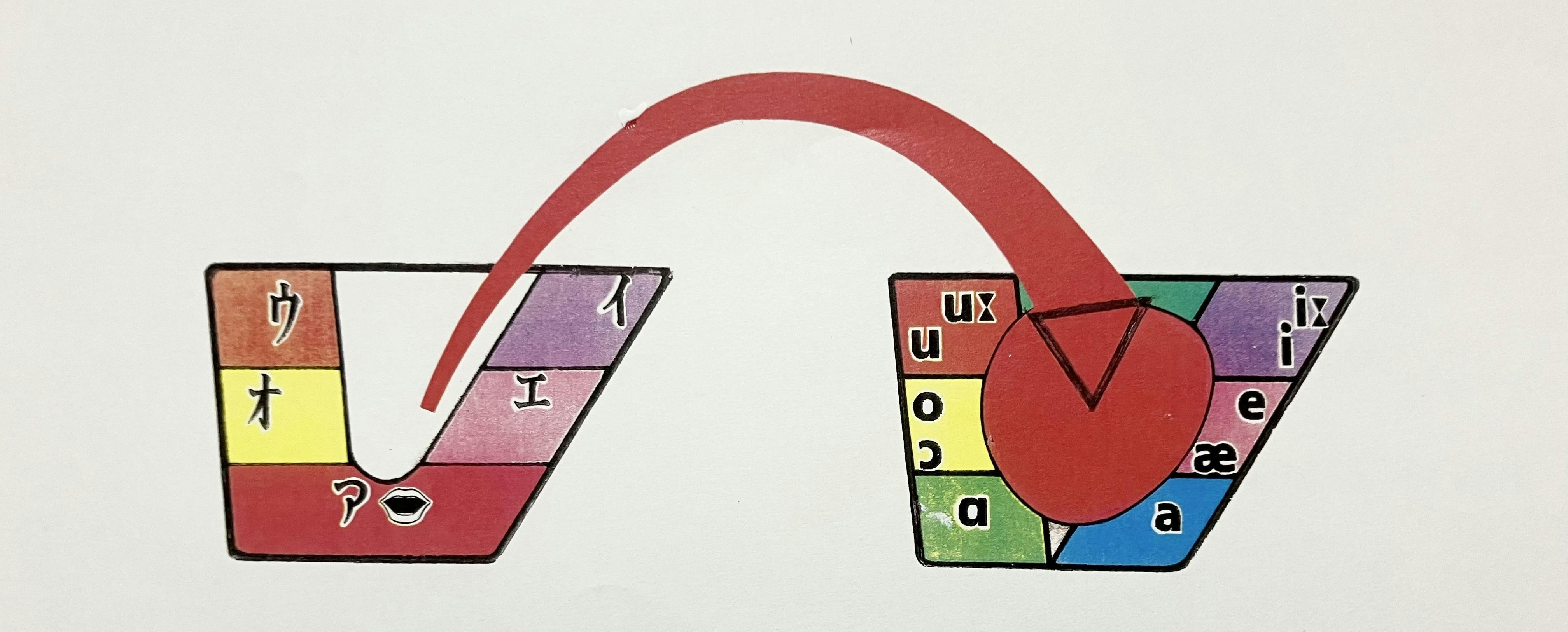 「日本語舌」で発音している私たち日本人が「英語舌」で発音するということは、英語の個々の発音を日本語の音の体系の中に引き込むということではなく、下図のように 私たちの方から英語の発音の中心部に飛び込んで行くということなのです。つまり、日本語舌の状態を英語舌の状態にするということです。
