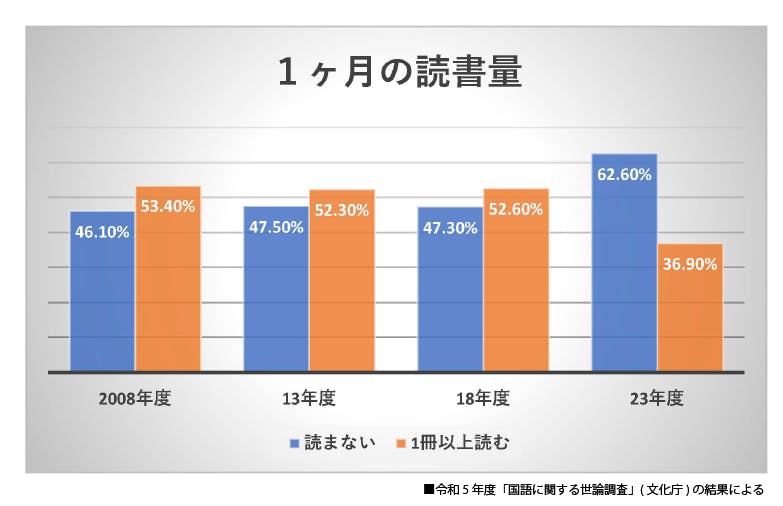 文化庁による、令和5年度「国語に関する世論調査」の結果によると、国民の1ヶ月あたりの読書量は年々減っており、「読まない」と答えた方の数は実に62.6%におよび、「1冊以上読む」と答えた方の36.9%を大きく上回っています。