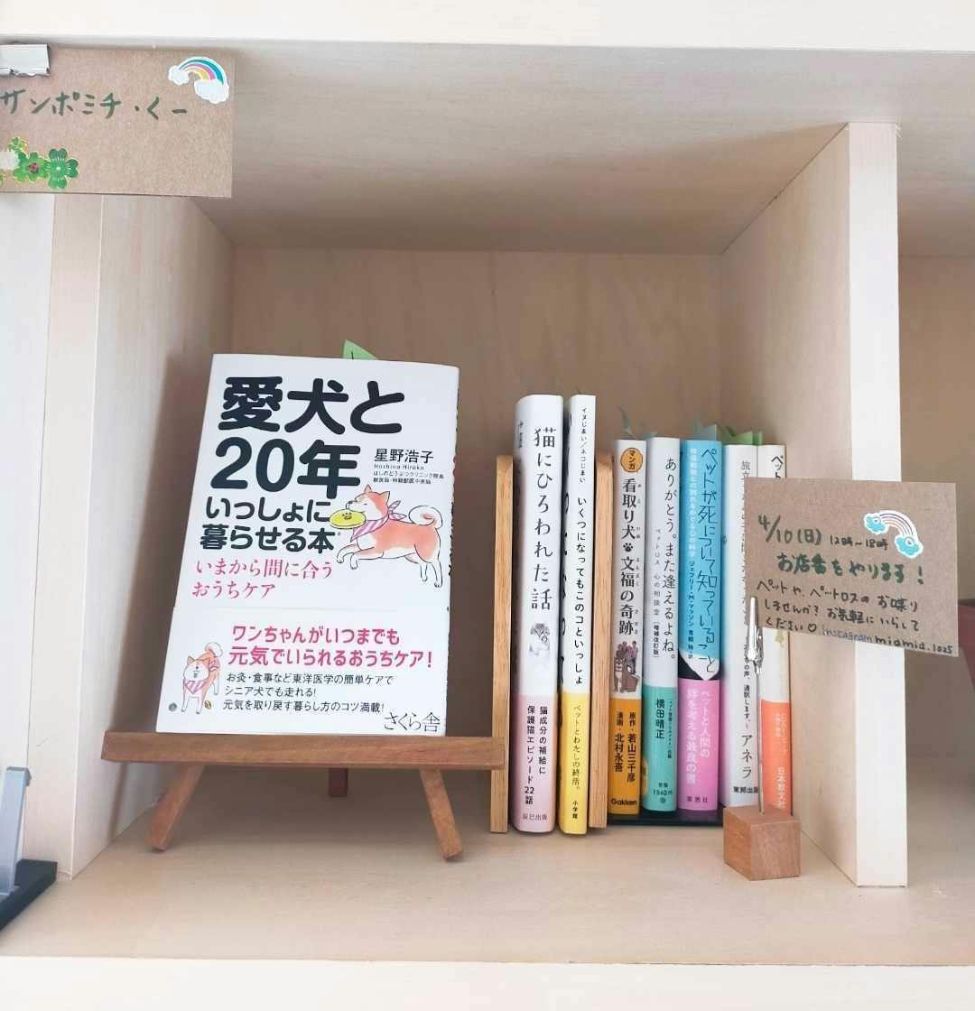 記念すべき棚主第一号「サンポミチ・くー」(あらいさん)さんには、ペットロスに向き合ってこられた経験が伺える本たちが並び、お店番の時には、各地から集まったペットロスの方々に寄り添う、あたたかい癒しの空間を育んでいました。